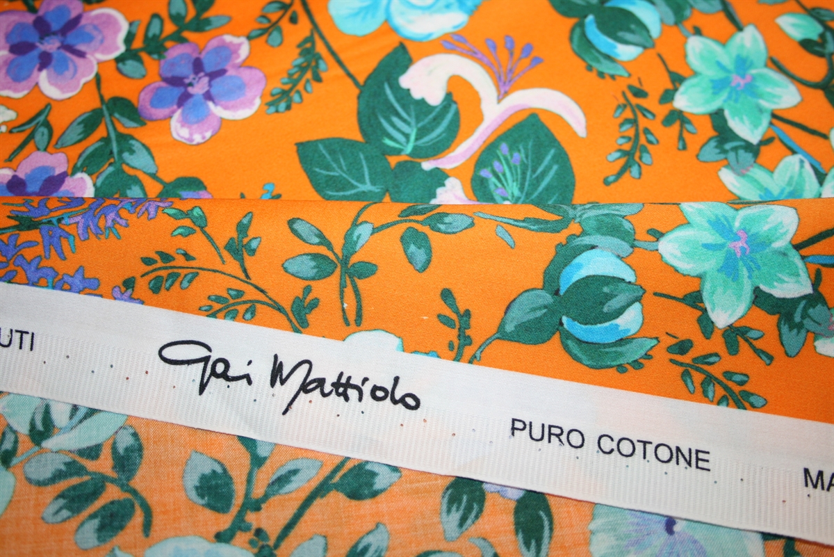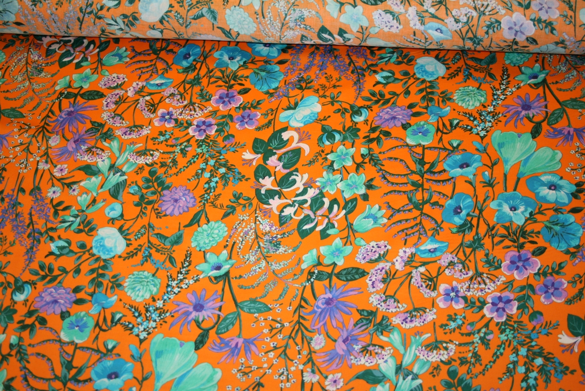 Dette bomuldsstof er produceret i Italien for den italienske modeskaber Gai Mattiolo. Stoffet er vævet i en blød, naturlig bomuldskvalitet og har en diskret satineret finish, der giver et elegant skær uden at tage opmærksomheden fra det iøjnefaldende print. Bundfarven er en intens, varm orange (ala æggeblomme), som skaber en strålende kontrast til det botaniske mønster. Blomstermotiverne varierer i nuancer af turkis, mint, jadegrøn, lavendel, lilla og petroleumsblå, der tilsammen danner et dynamisk, men harmonisk farvespil. De mørkegrønne blade og stilke skaber dybde og balance. De forskellige blomstertyper og størrelser – fra små klokkeblomster til store, åbne kronblade – giver et sanseligt og kunstnerisk udtryk. Stoffet egner sig særligt godt til lette kjoler, bluser, skjorter eller sommerbukser.
