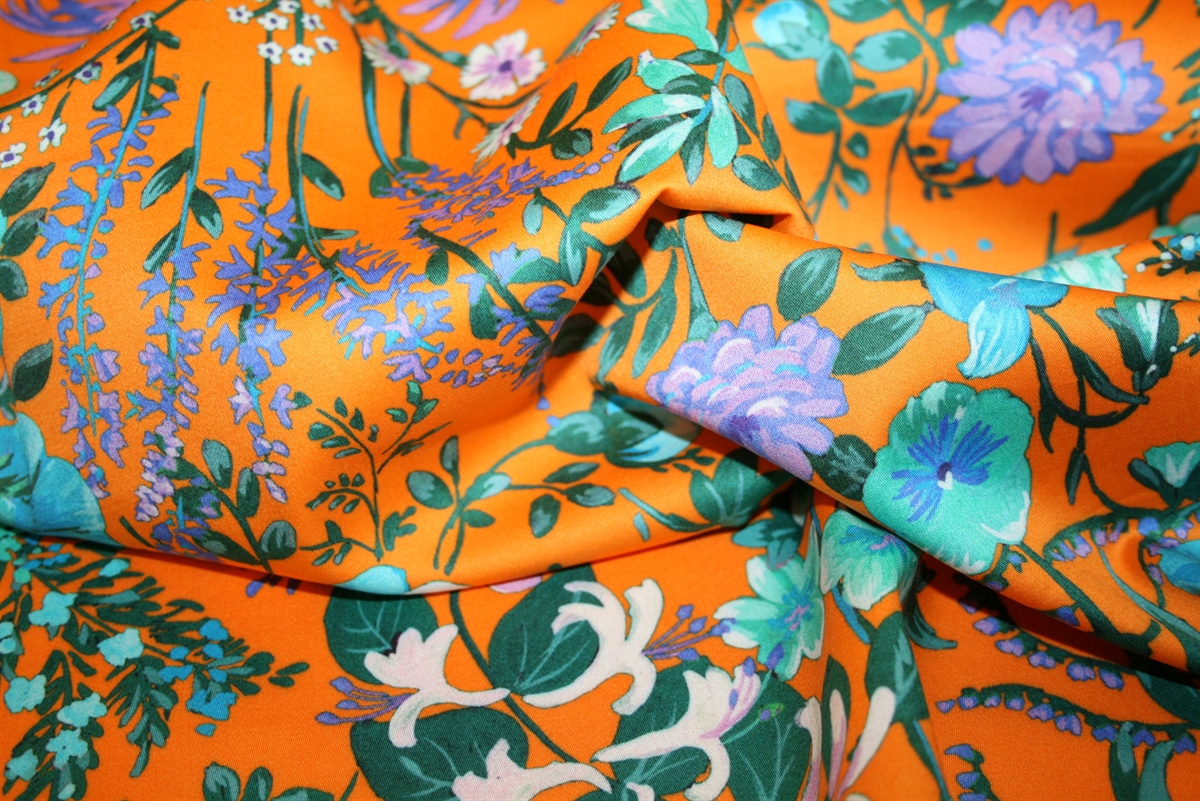 Blød bomuld med et smukt blomsterprint på en intens orange bund. Stoffet har en subtil satineret finish og kvaliteten er let og virkelig lækker. Stoffet er produceret for Gai Mattiolo.