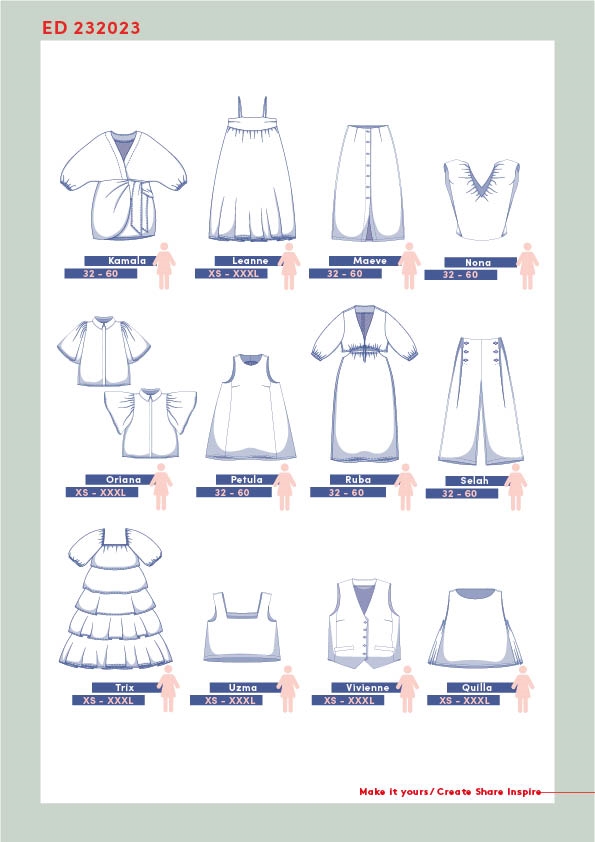 Bladet indeholder 12 forskellige mønstre i fuld størrelse, der er lige til at tegne af. De fleste modeller kommer i størrelse XS-XXXL. Vejledninger er på engelsk.