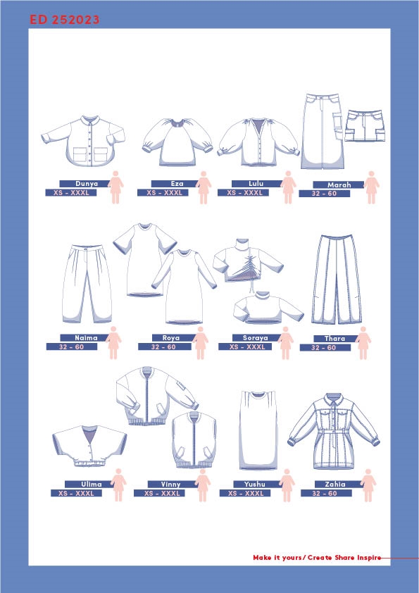 Bladet indeholder 12 forskellige mønstre i fuld størrelse, der er lige til at tegne af. De fleste modeller kommer i størrelse XS-XXXL. Vejledninger er på engelsk.