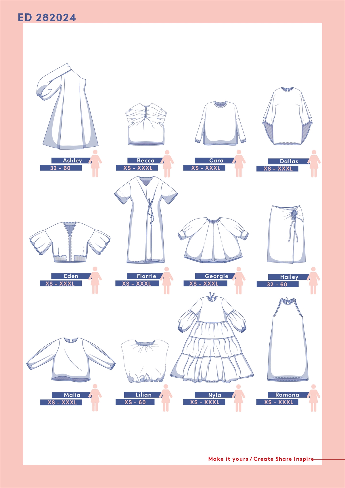 Bladet indeholder 12 forskellige mønstre i fuld størrelse, der er lige til at tegne af. De fleste modeller kommer i størrelse XS-XXXL. Vejledninger er på engelsk.
