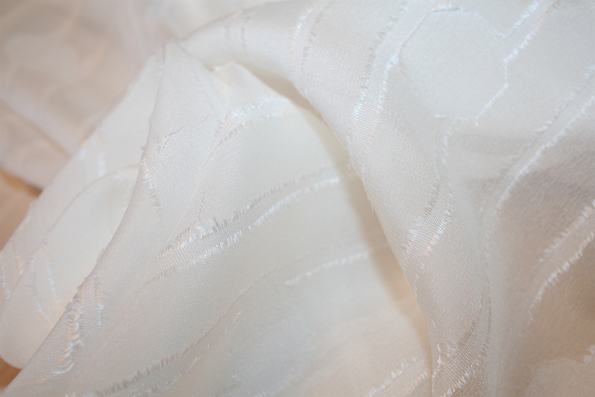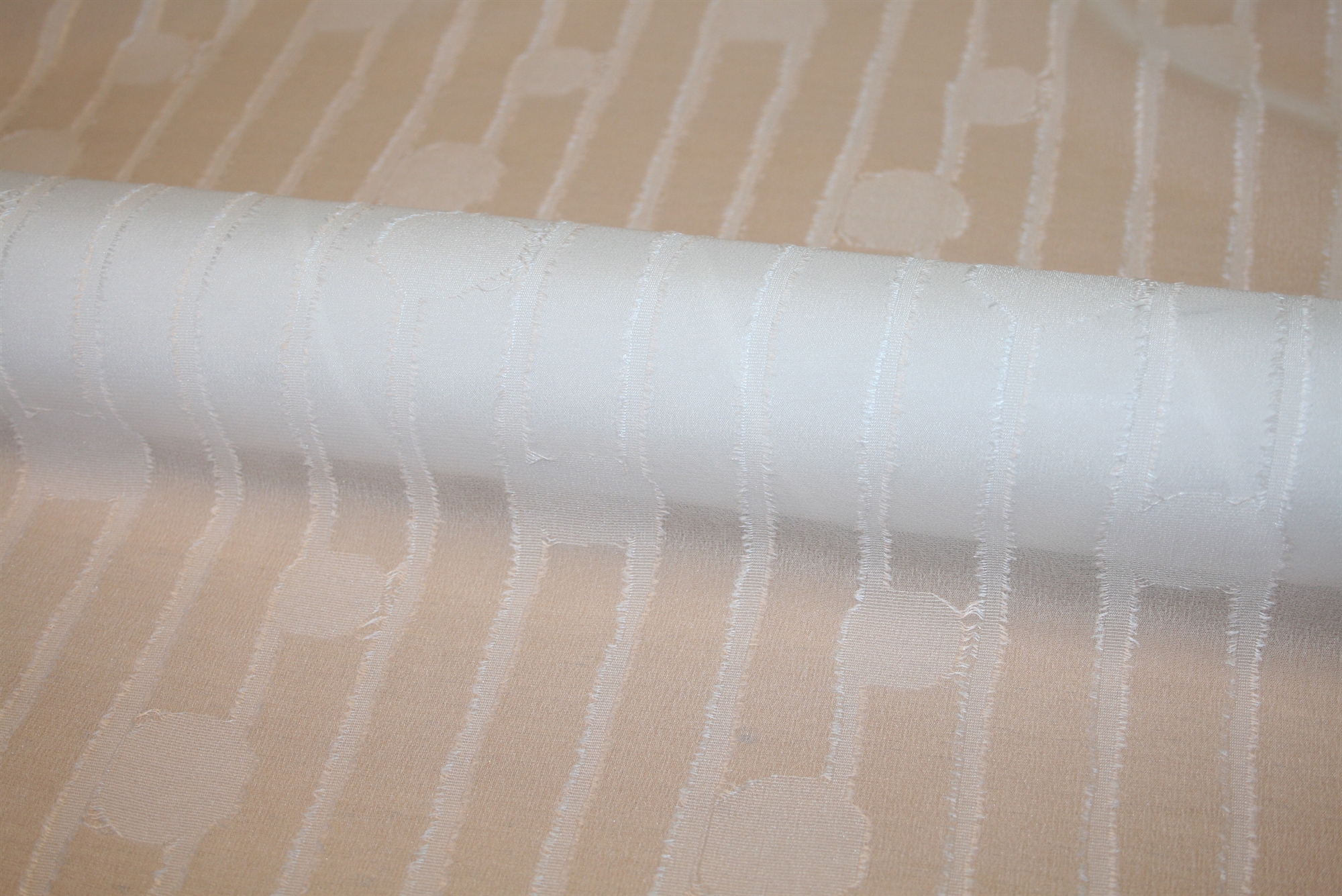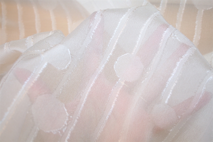 Hvid fil coupé i 100% silke med cirkler og lodrette striber. Fil coupé er en særlig væveteknik, der giver en taktil frynseeffekt på stoffet. Kvaliteten er let og en smule sprød.