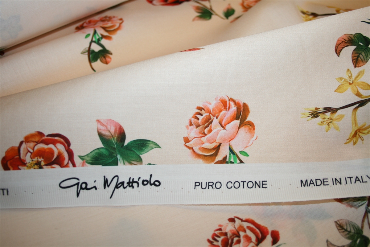 Lækker kvalitetsbomuld med et smukt vintage-inspireret blomsterprint på en lys bund. Stoffet har en let satineret finish og kvaliteten er let og blød og giver sig en smule på tværs. Stoffet er produceret for Gai Mattiolo.
