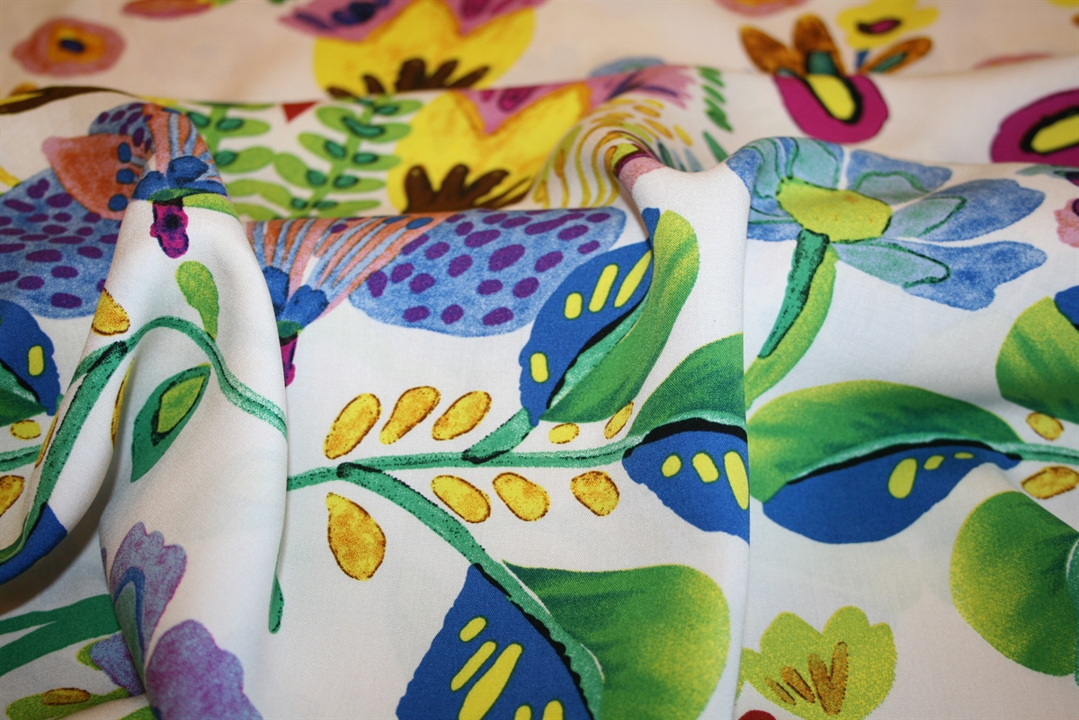 Viscose stof med farvestrålende blomster på en lys bundViscose stof med farvestrålende blomster på en lys bund