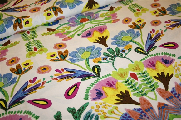 100% viskose med et farvestrålende blomsterprint på en lys cremerosa bund. En blød og lækker kvalitet, der er perfekt til fx kjole og nederdel.