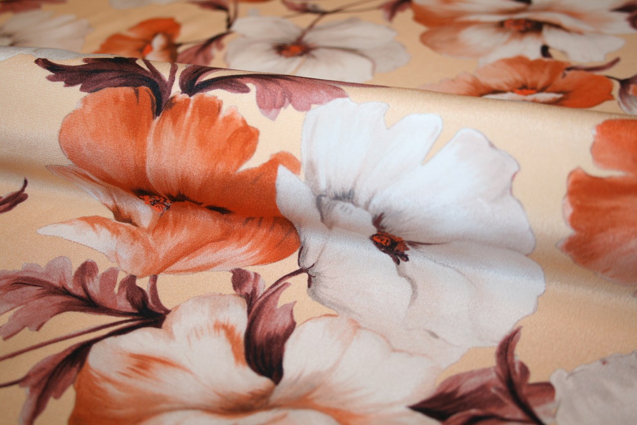 Silke crepe de chine med lidt større blomster på en pudderbrun bund. Stoffet giver sig let på tværs. Silken er produceret for Ferragamo.