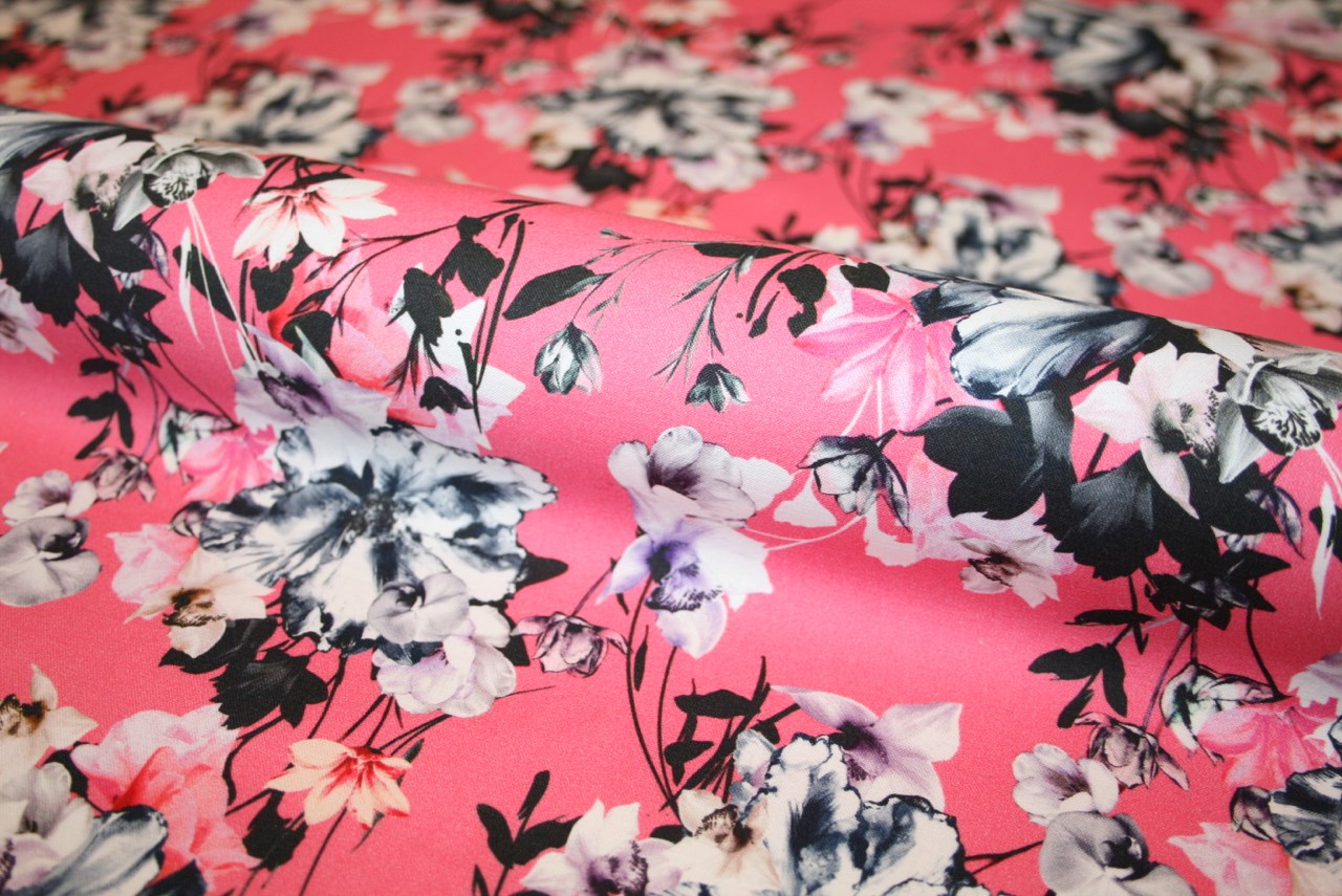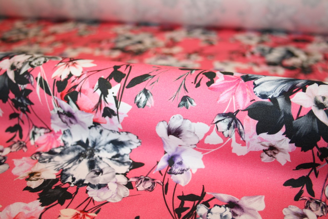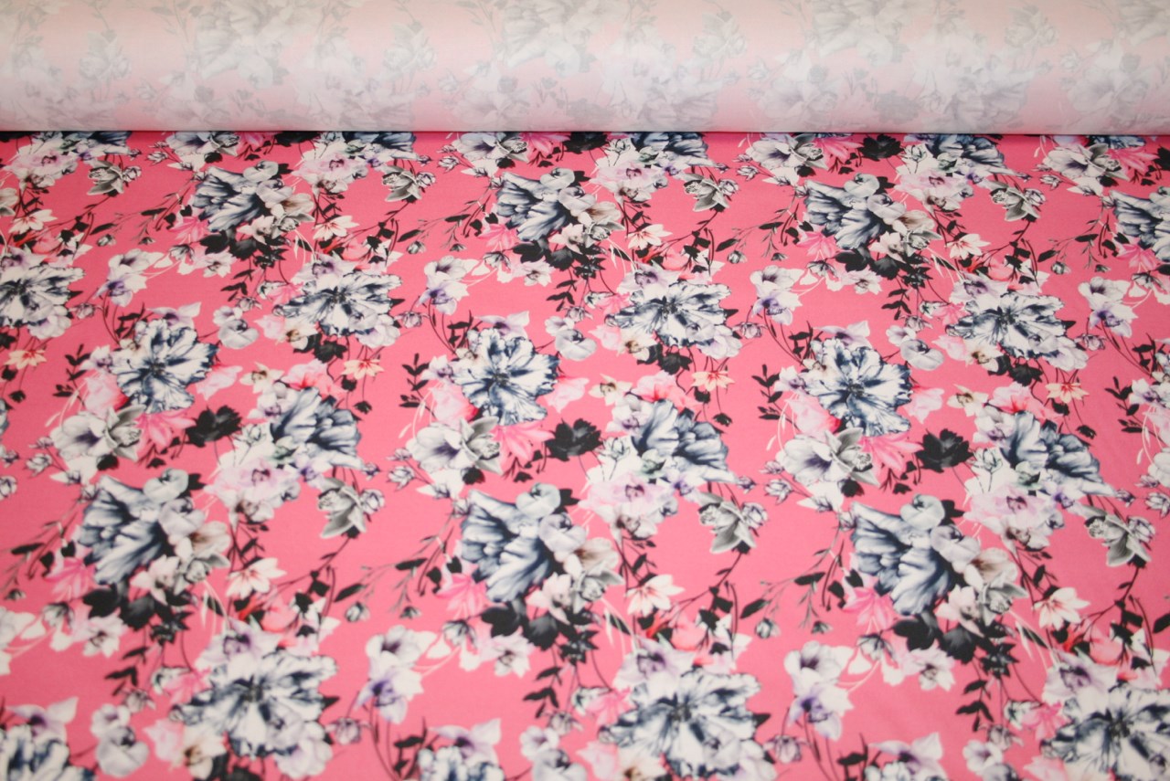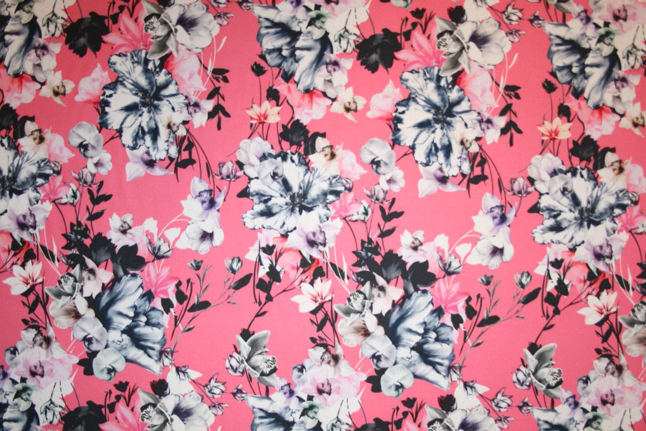 Bomuldsstretch med blomster på en pink bund. Kvaliteten er medium kraftig og med et behageligt komfortstræk. Stoffet er produceret for Blumarine.