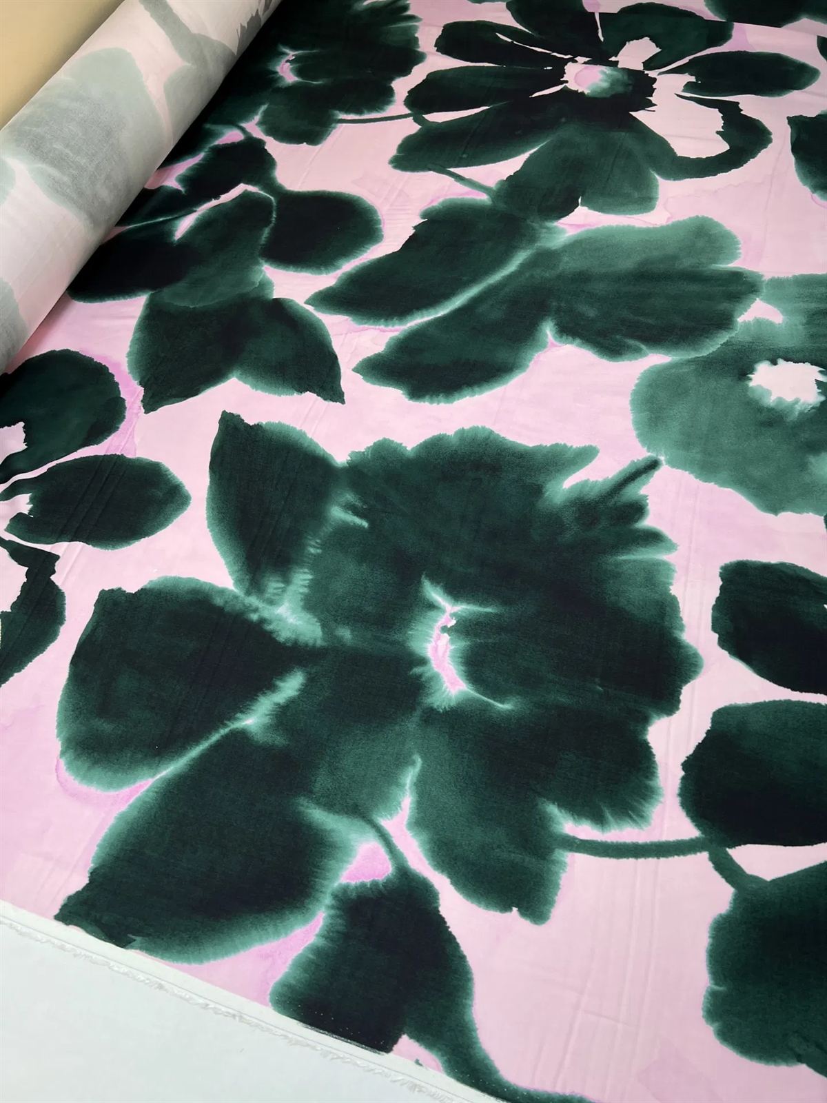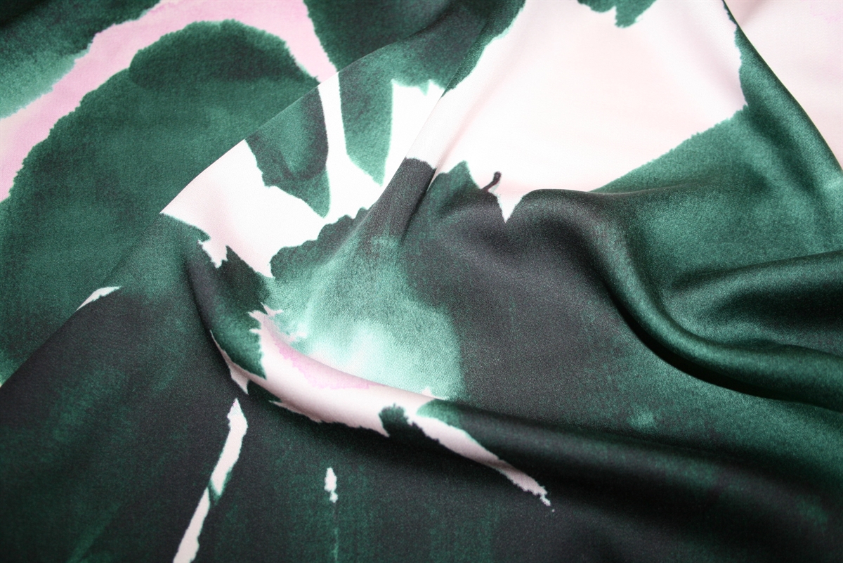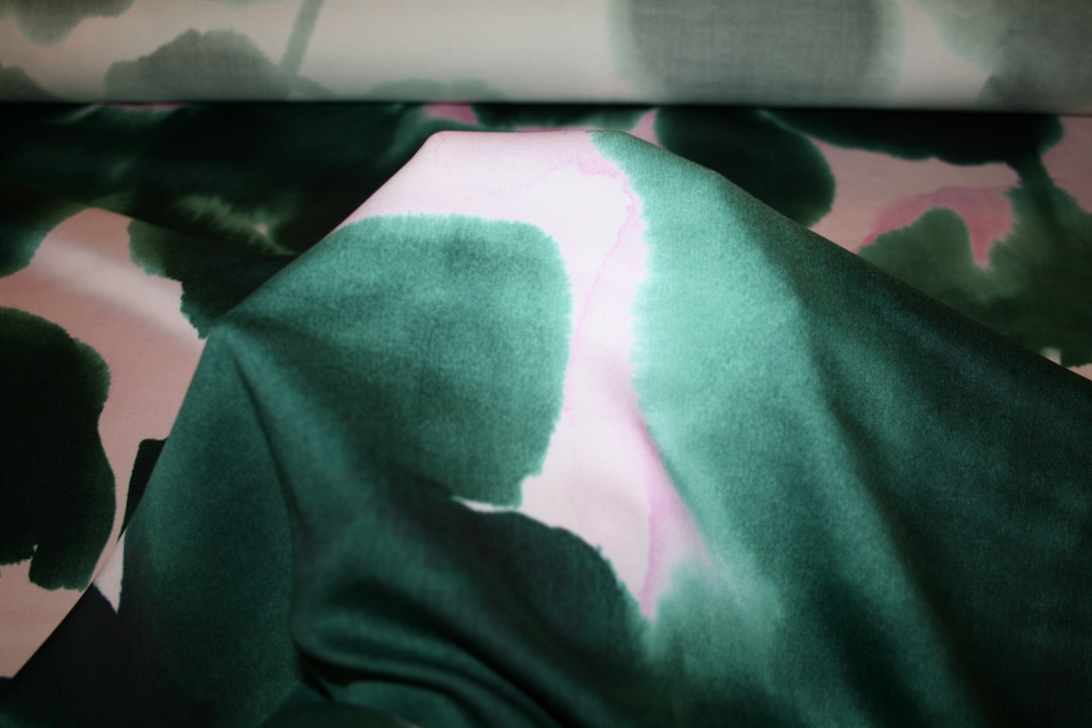 Satinvævet viscose med store grønne maleriske blomster på en lyserød bund. Kvaliteten er let og blød.