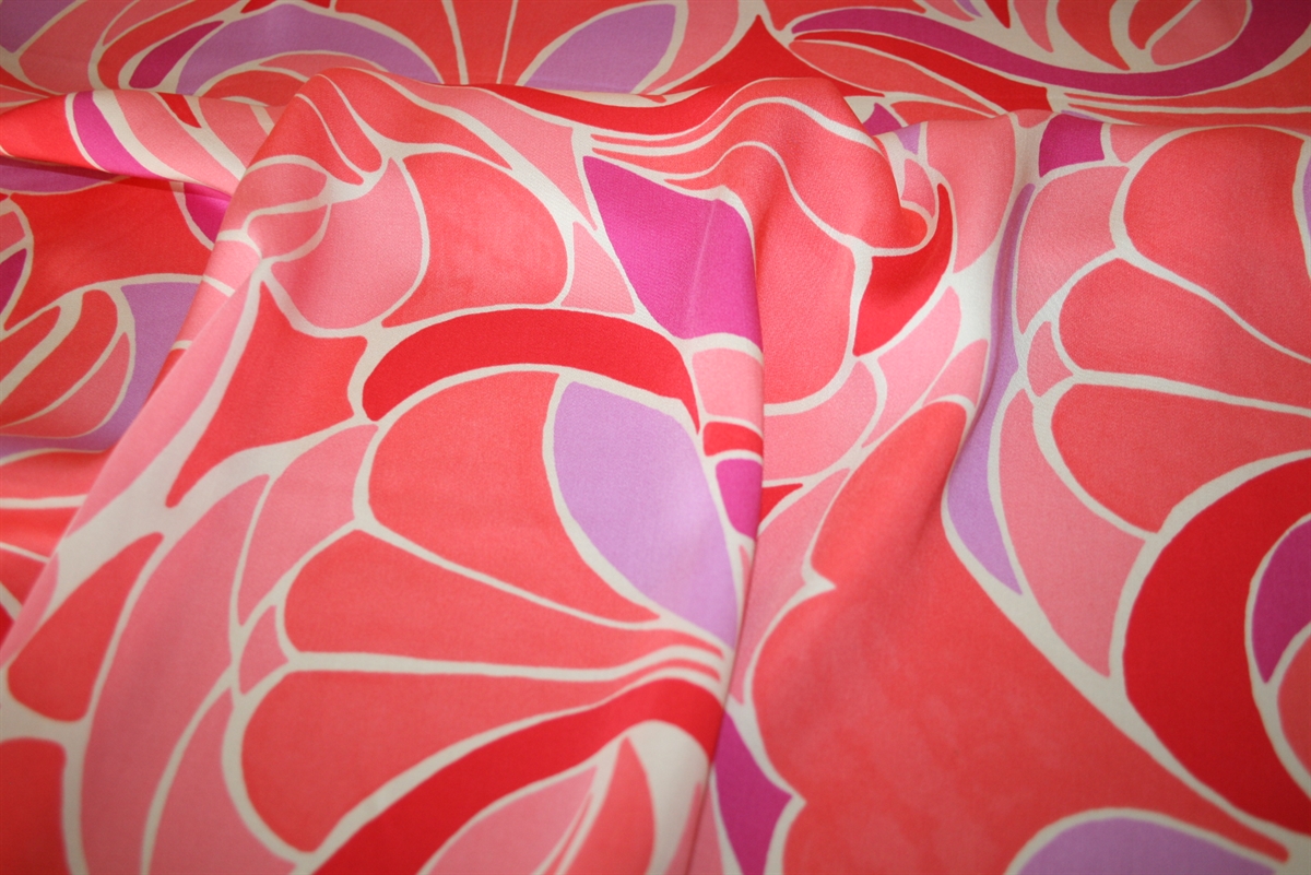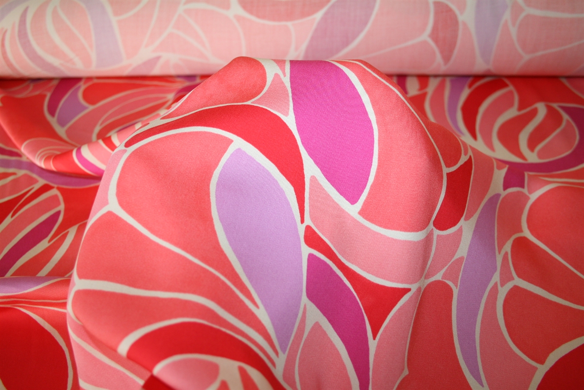 Satinvævet viscose med sommerligt print i bølgende former. Kvaliteten er let og blød og falder naturligt ind til kroppen.