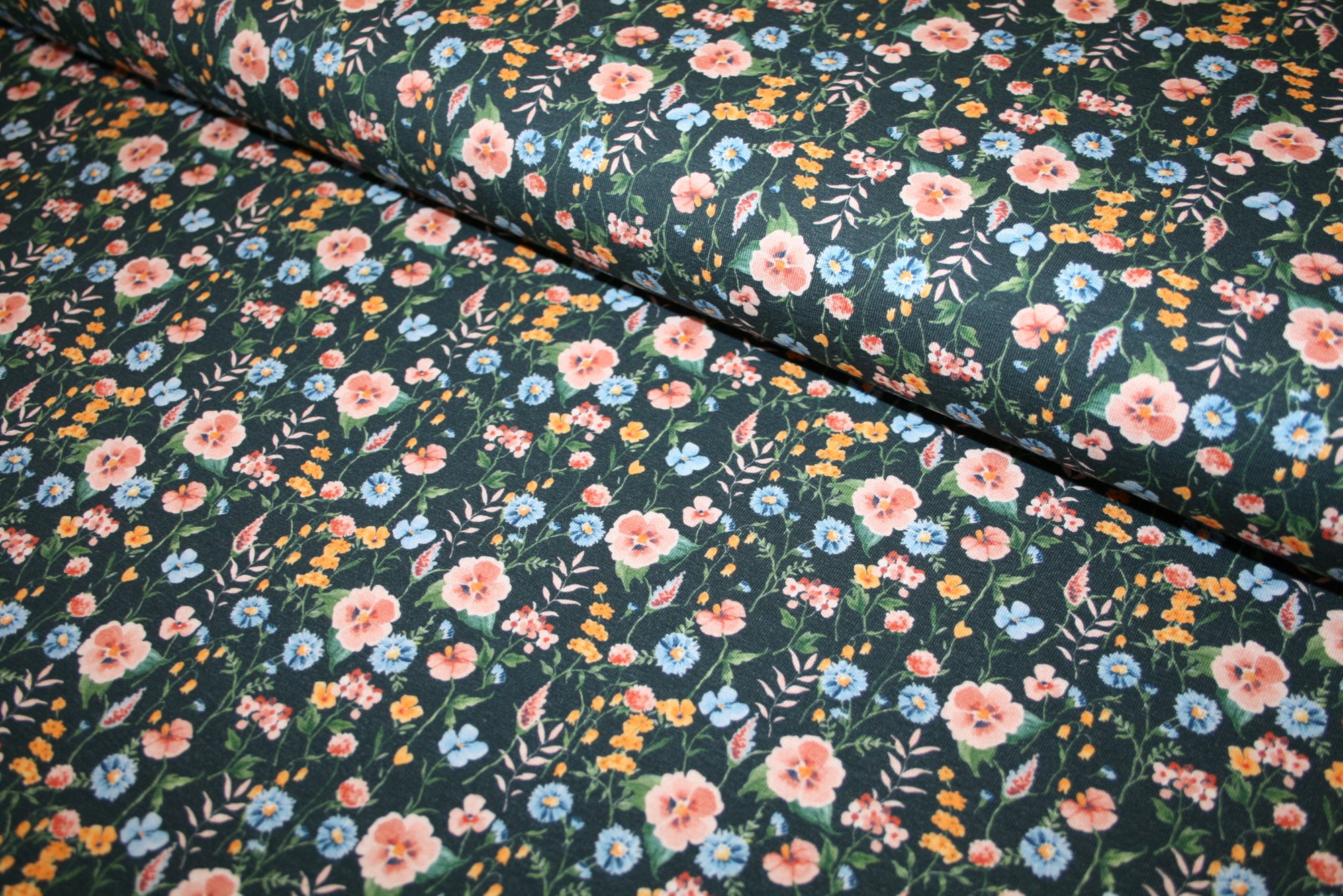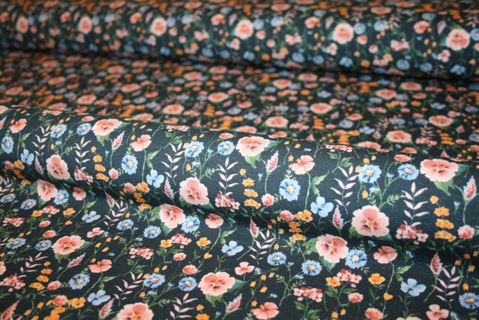 Oeko-tex certificeret bomuldsjersey med blomster på en navy bund.