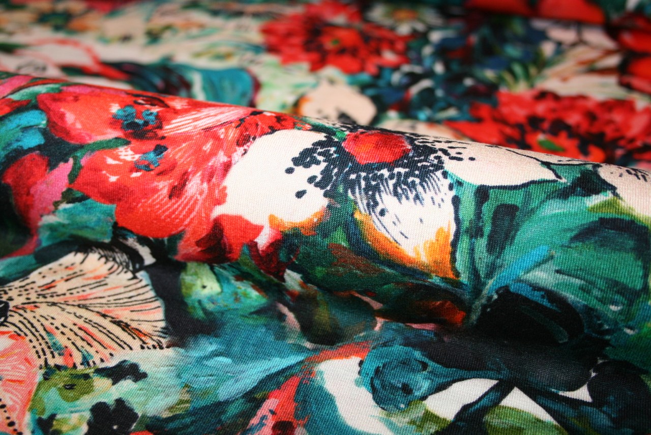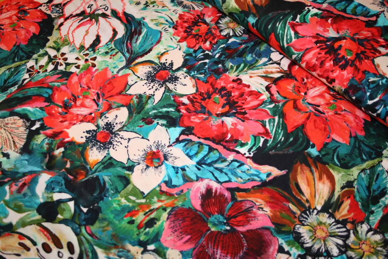 Lækker oeko-tex certificeret viscose jersey med farvestrålende blomster.
