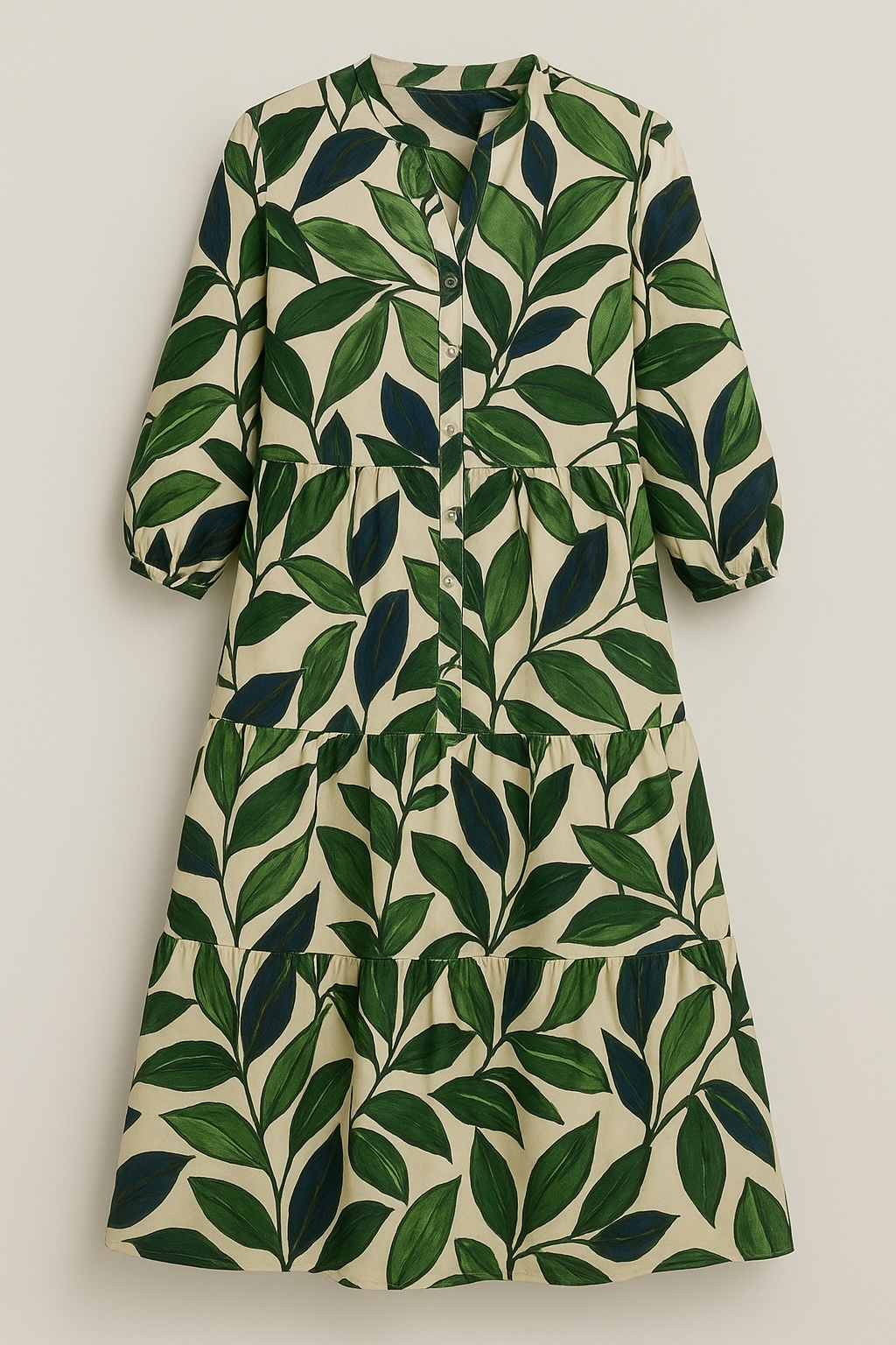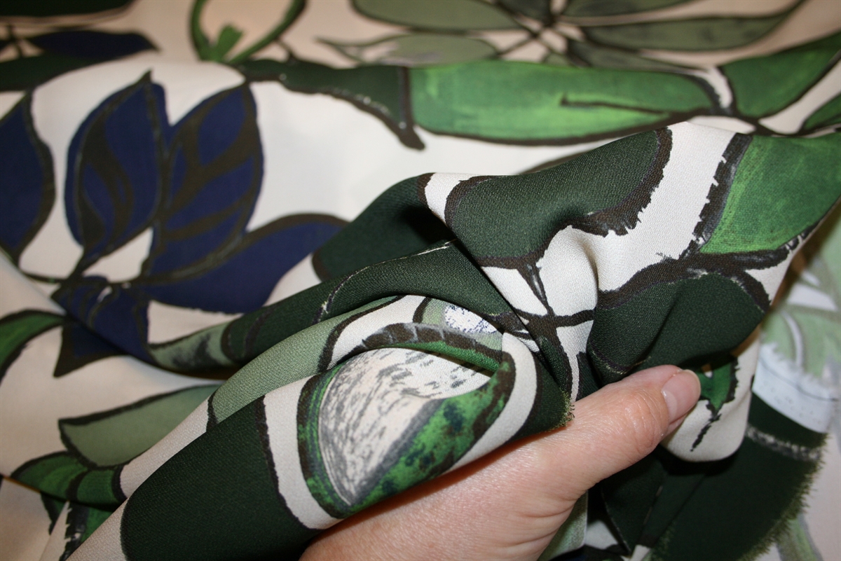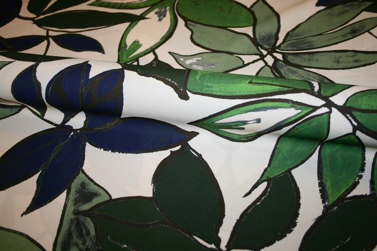 Denne smukke viskose crepe har et moderne og elegant bladprint i nuancer af sand, grønne nuancer, marineblå og sort. Stoffet har den karakteristiske, let kornede crepe-struktur, som giver en diskret tekstur og et smukt, levende spil i overfladen. Stoffet falder blødt og flydende, hvilket gør det ideelt til kjoler, bluser, skjorter, nederdele eller lette bukser.