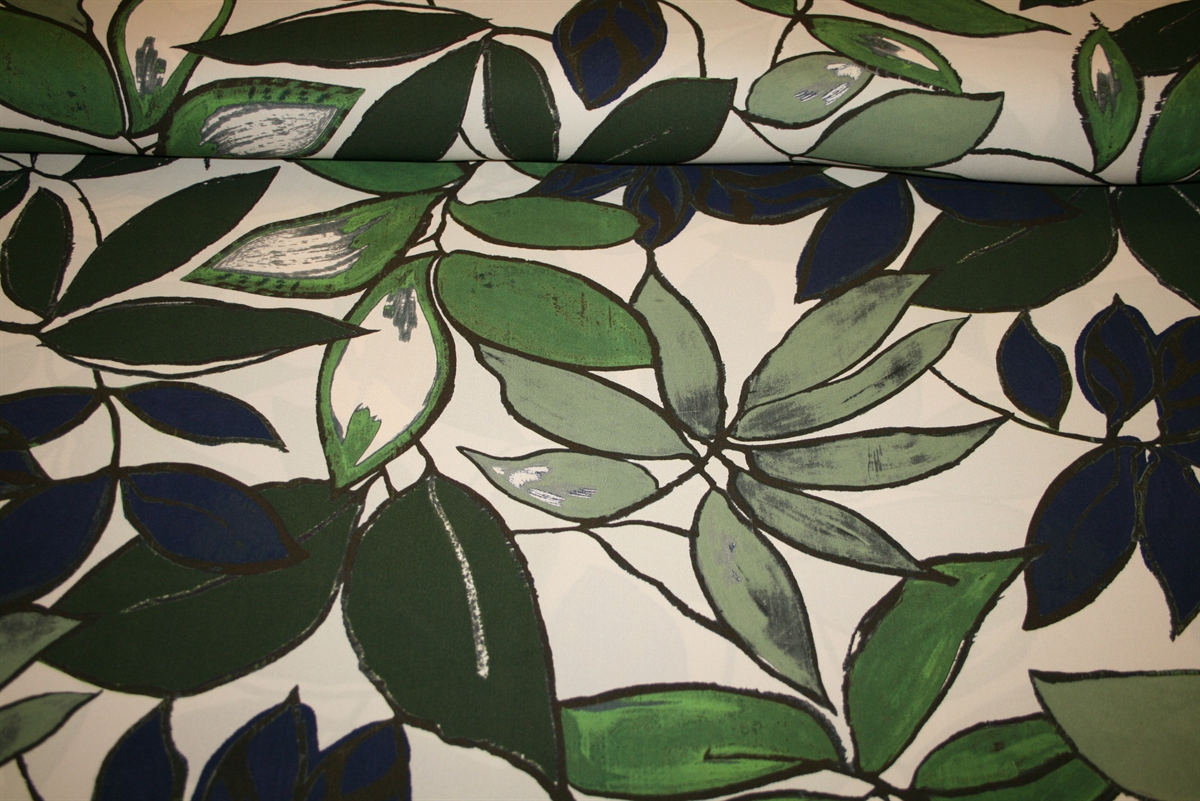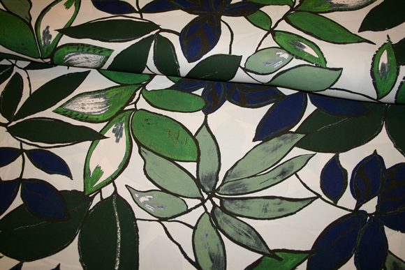 Crepevævet viskose med et smukt og lidt større bladmønster i grøn og blå på en sandfarvet bund.