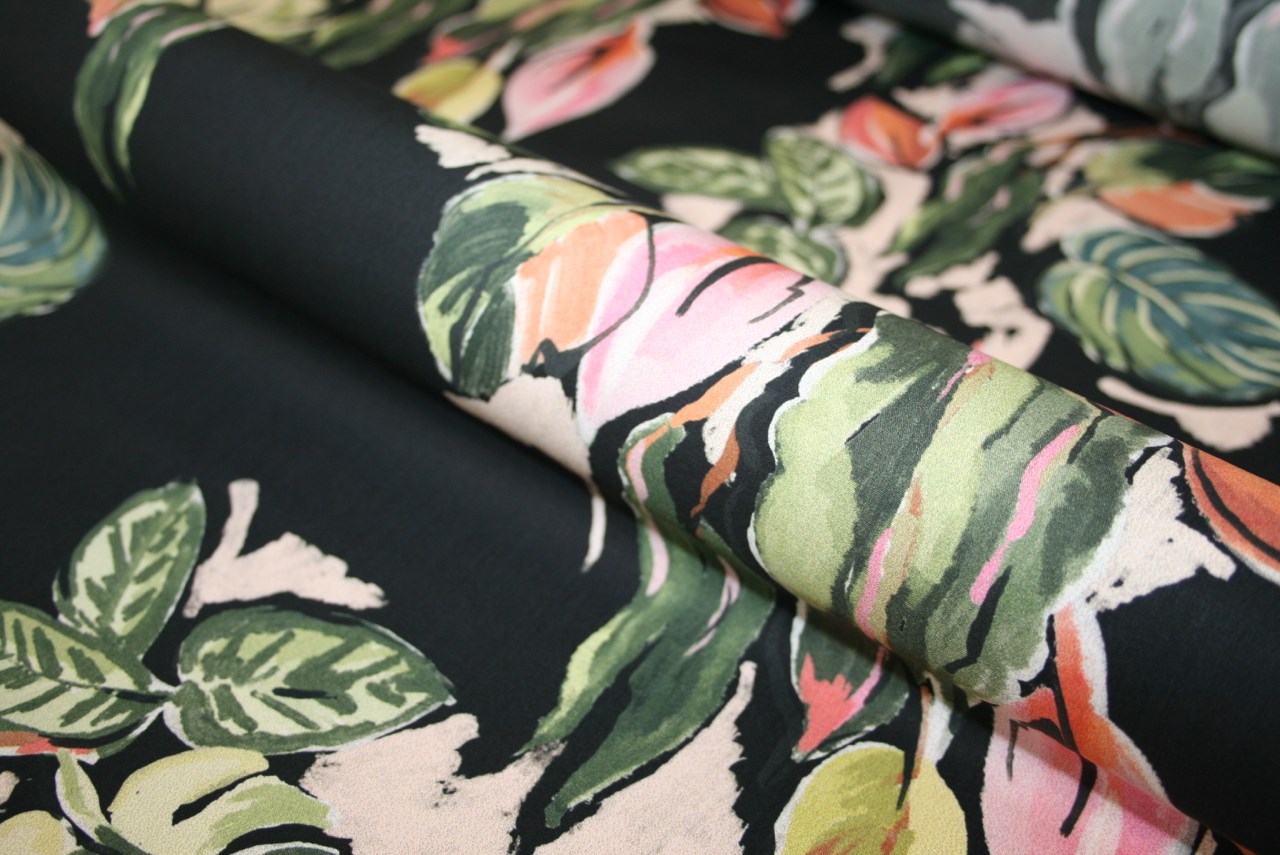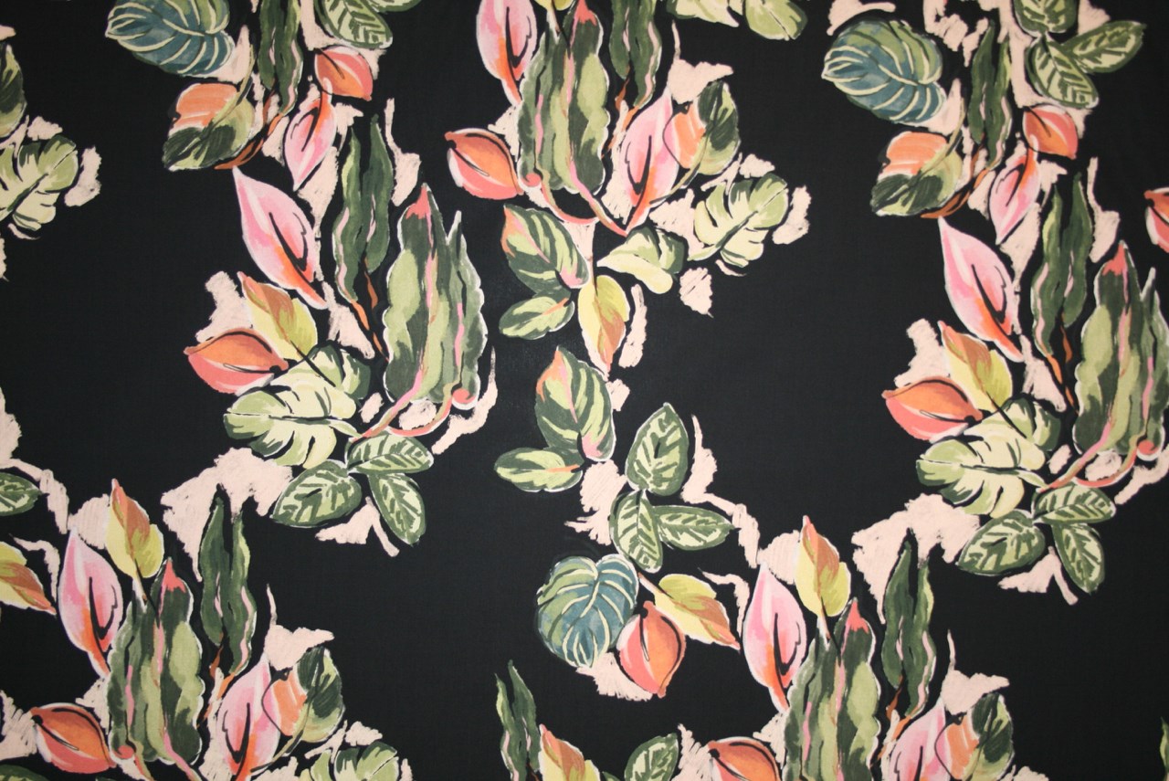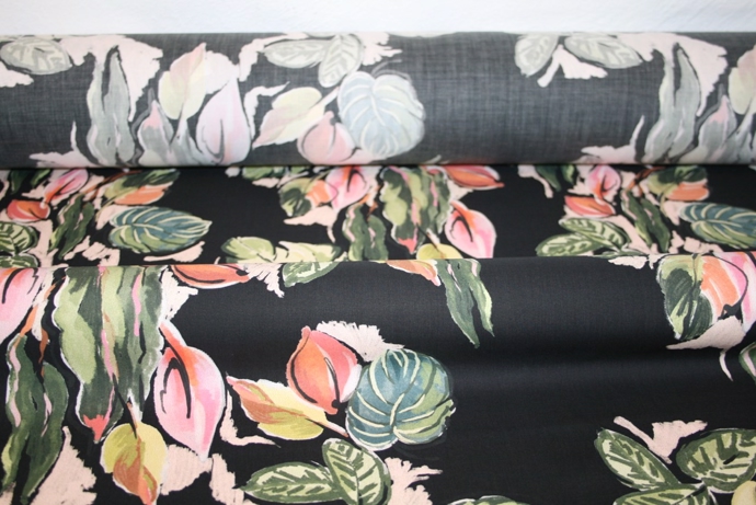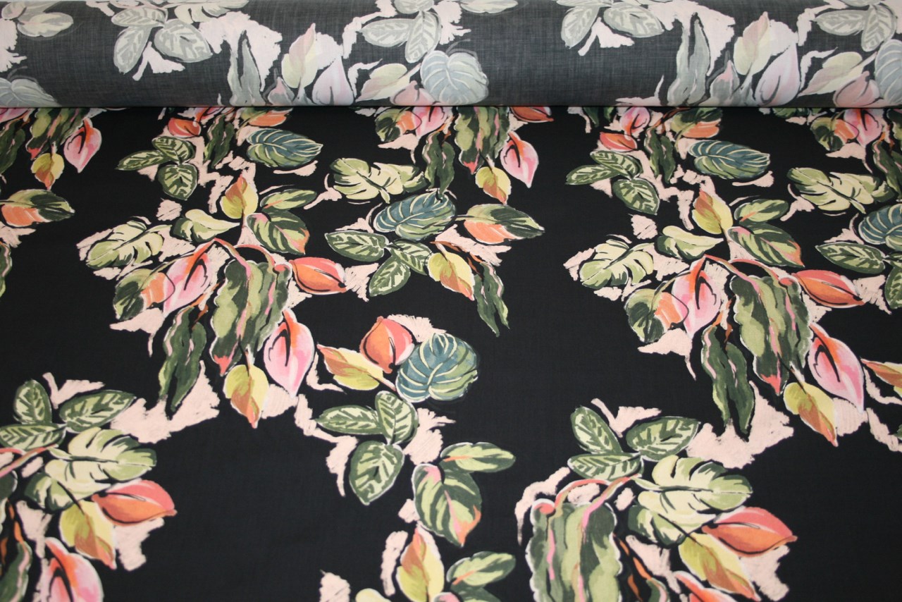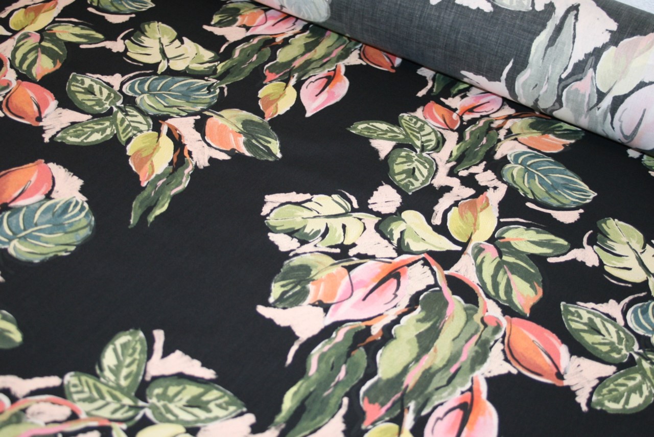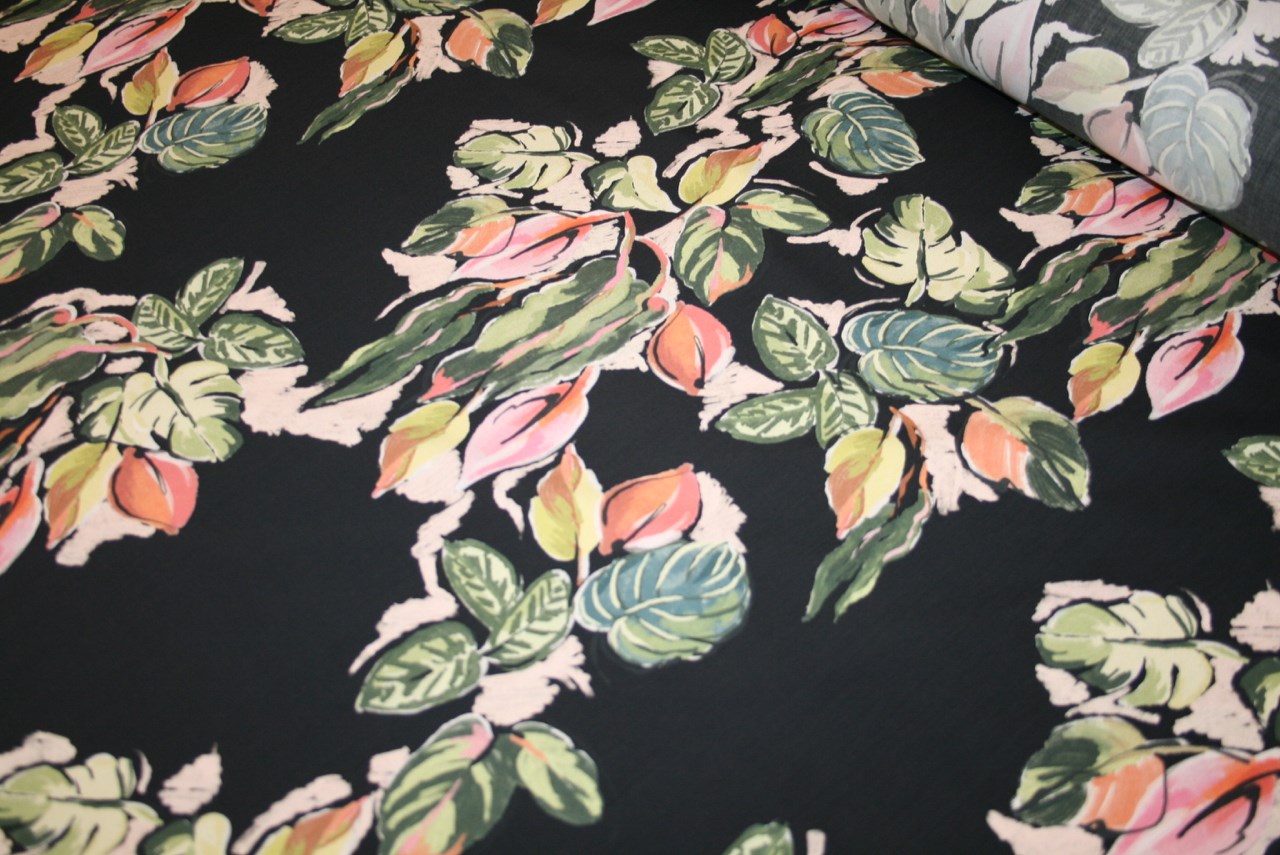 Vævet bomuld med et større bladprint på en sort bund. Let og crisp italiensk kvalitet, der giver sig en smule på tværs.