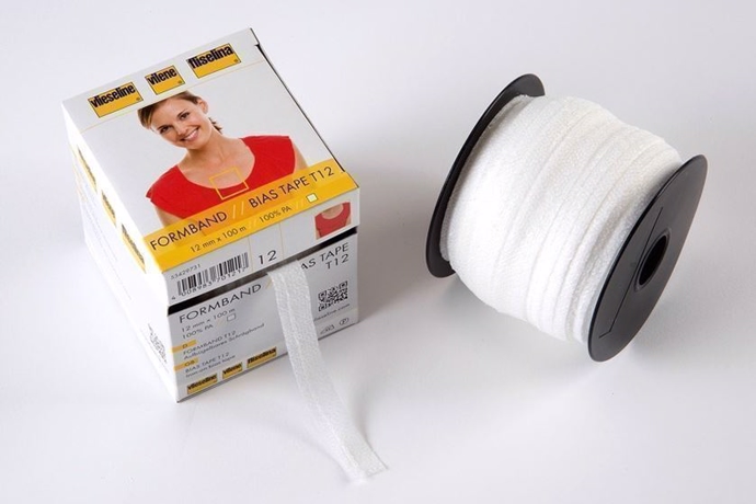 Freudenberg vlieseline 12 mm. formbånd med kædestikning til stabilisering af sømme (fx halsudskæring, skulder og ærmegab).