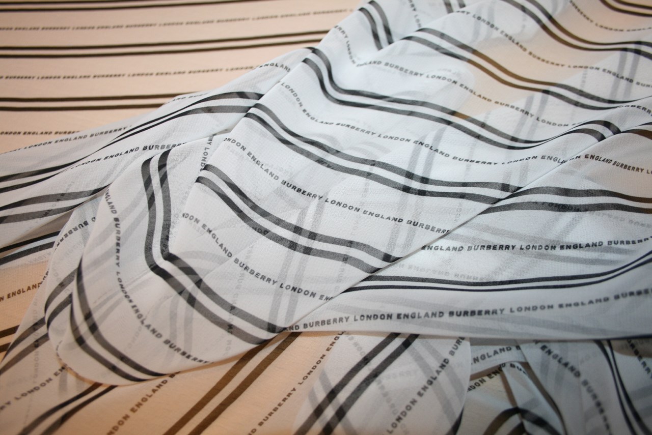 Hvid chiffon med sorte vandrette striber og tekst produceret for Burberry. Kvaliteten er lækker og blød.