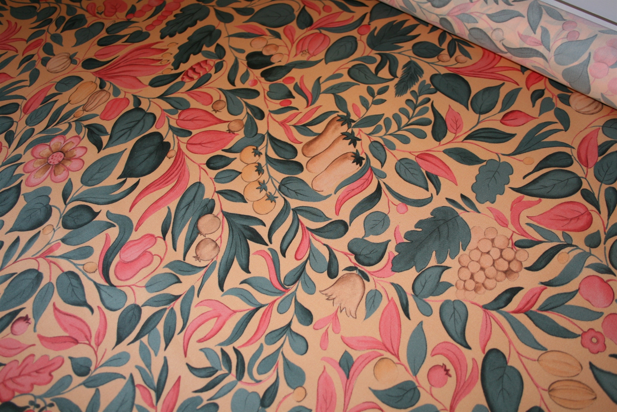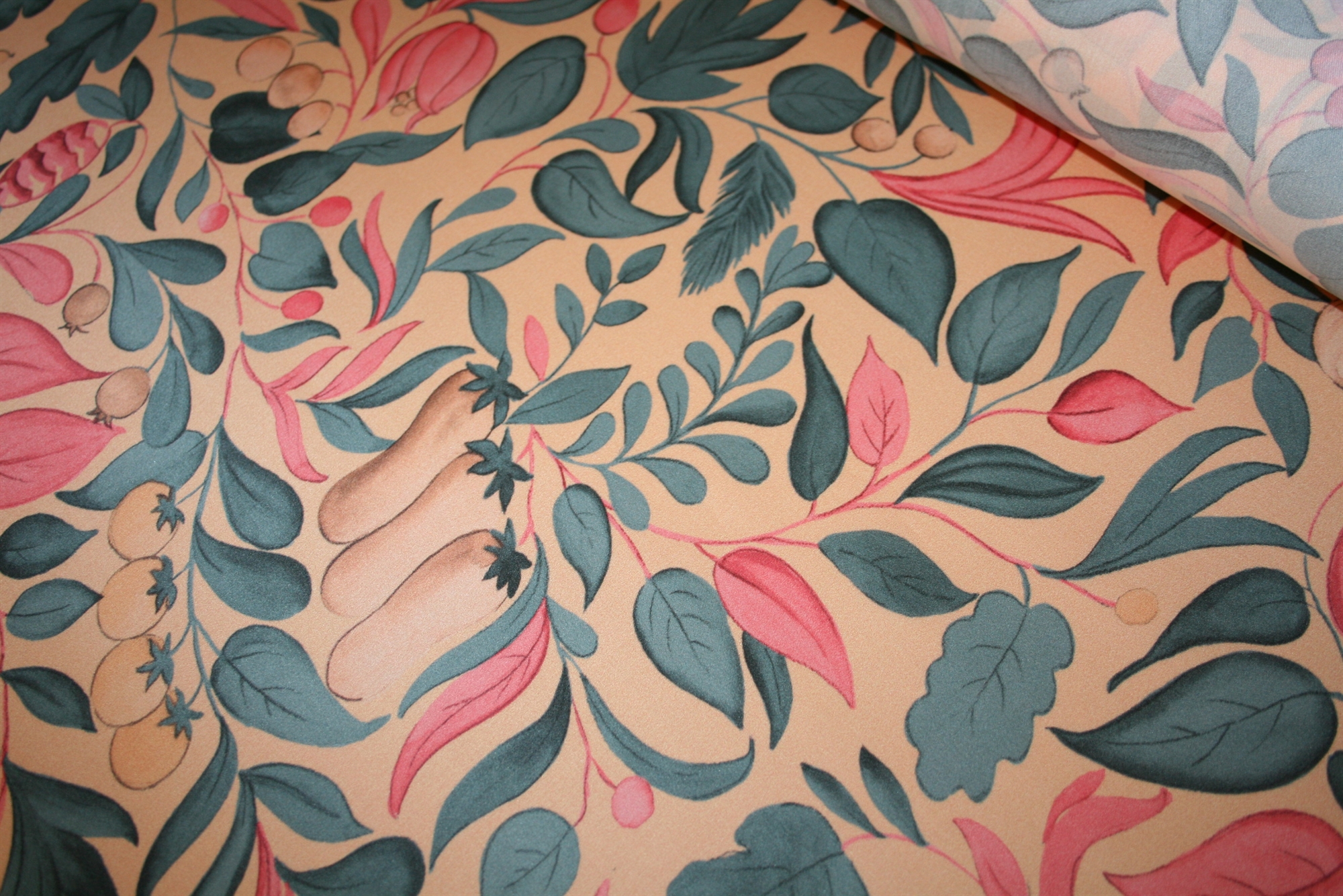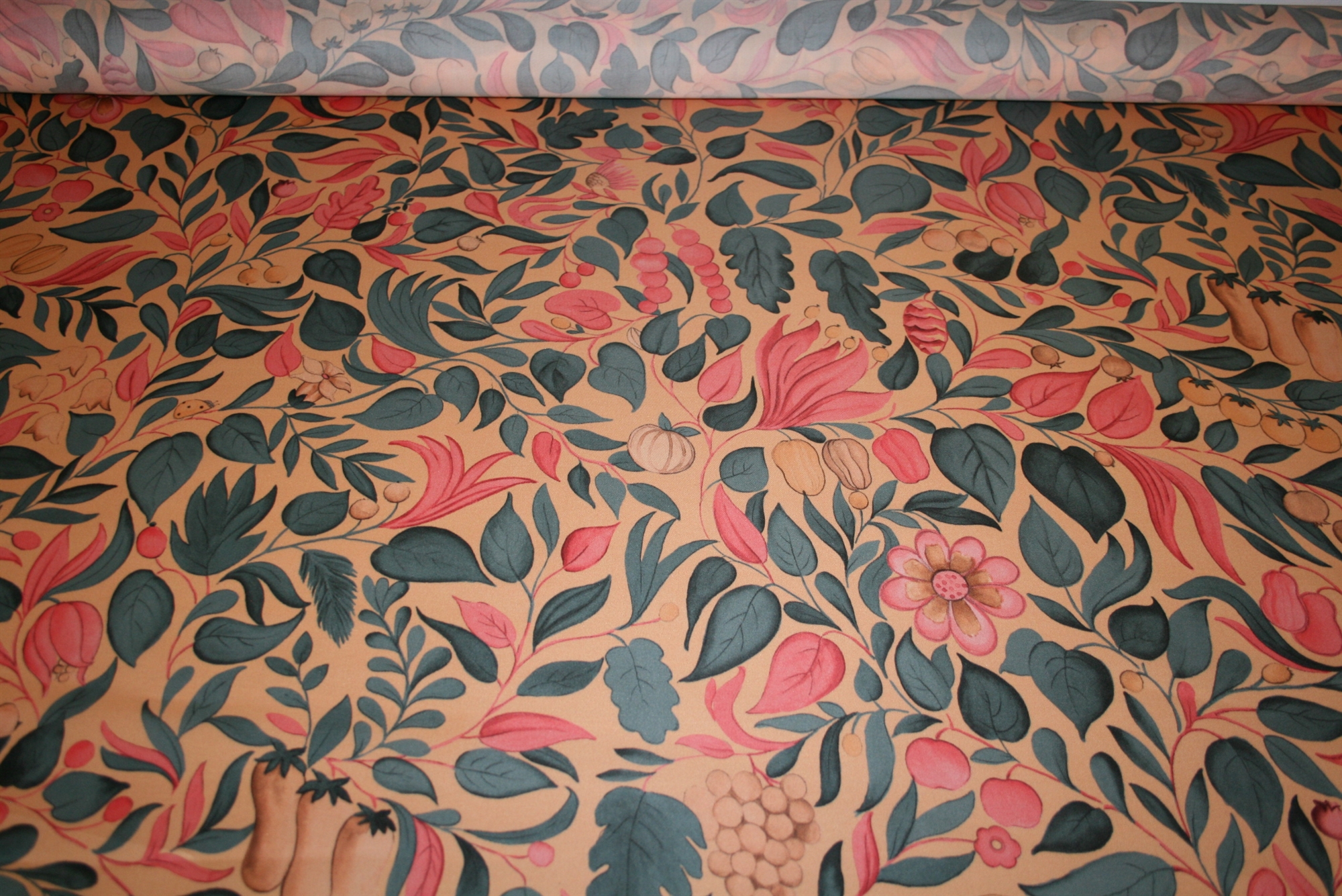 Silke satin med frugter og blomsterSilke satin med frugter og blomsterSilke satin med frugter og blomster