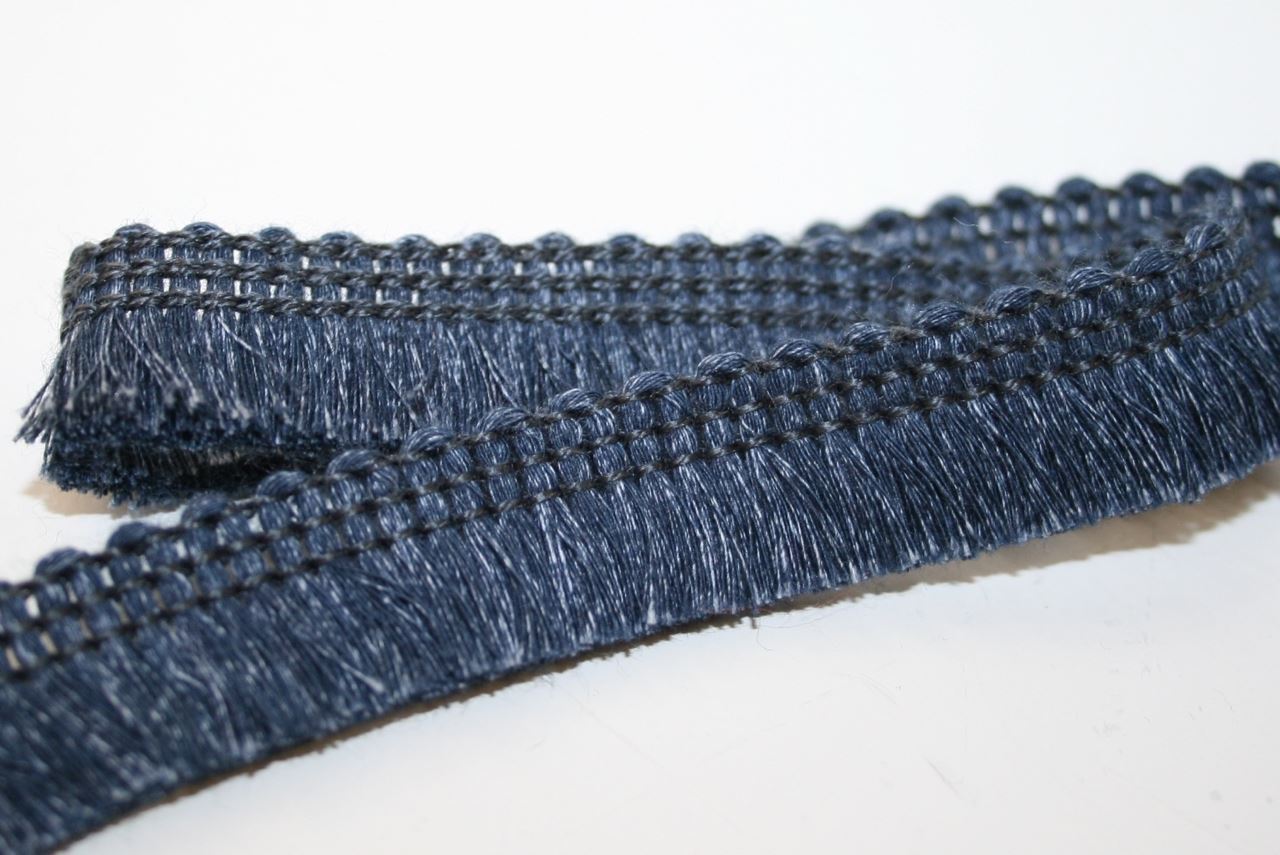 Jeansblå frynsebånd i blød bomuld. Båndet er 15 mm. i højden, heraf 10 mm. frynser.