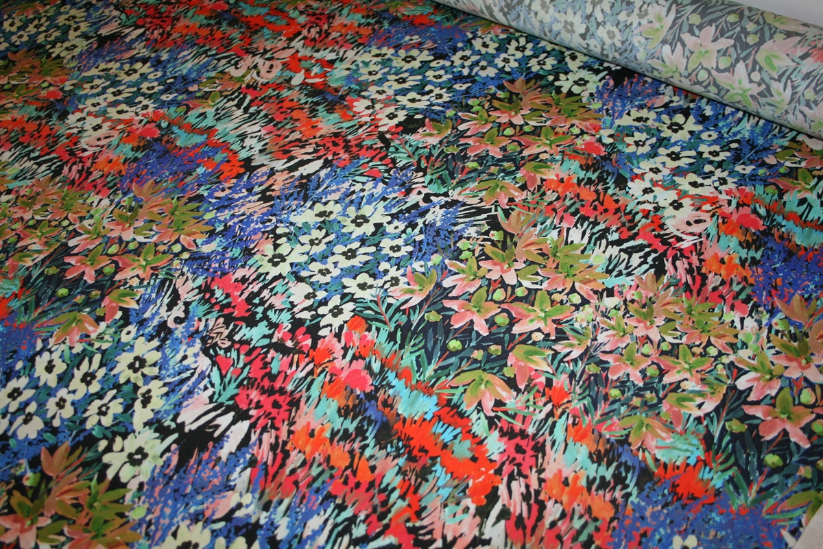 Viscose crepe med farvestrålende blomsterViscose crepe med farvestrålende blomsterViscose crepe med farvestrålende blomster
