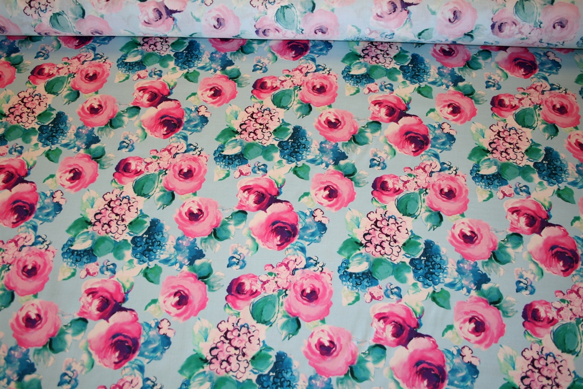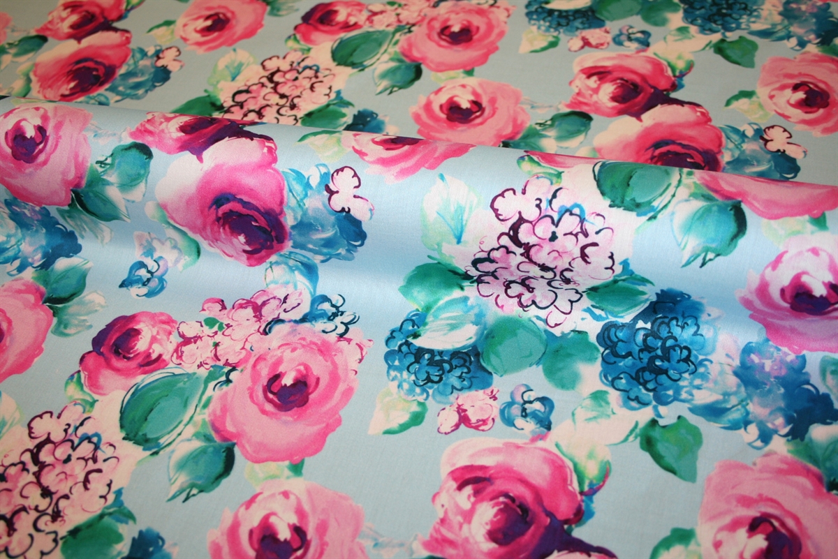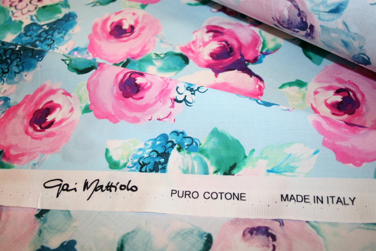 Lækker bomuld med et smukt blomsterprint i pink og blå nuancer på en lyseblå bund. Stoffet har en let satineret finish og kvaliteten er let og giver sig en smule på tværs. Stoffet er produceret for Gai Mattiolo.