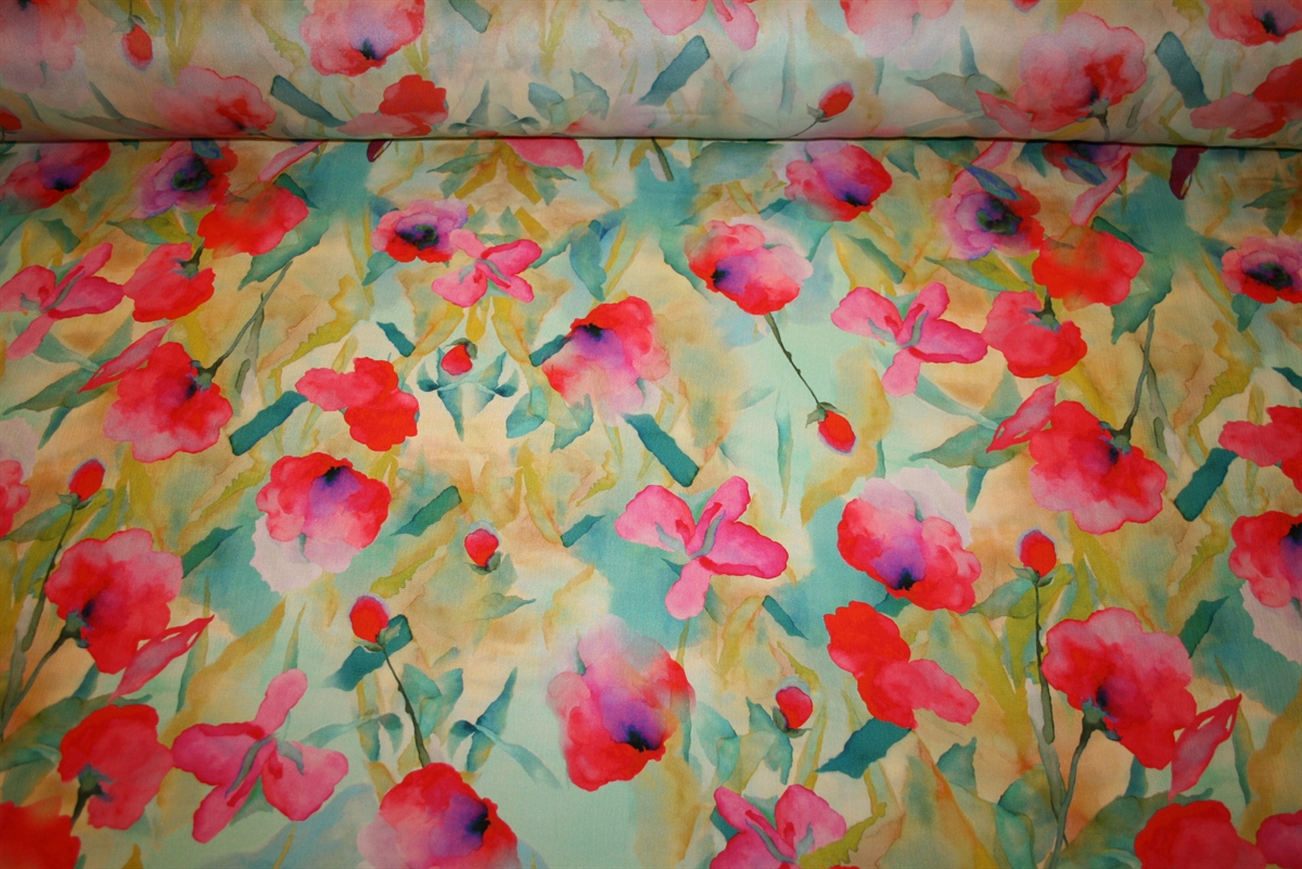 Dette eksklusive silkestof er en let kvalitet på 65 g/m², hvilket giver det et elegant, svævende fald og en næsten vægtløs fornemmelse. Vævningen har en diskret struktur, som tilfører stoffet et subtilt spil og giver printet en smuk, let tekstureret dybde. Designet er som et håndmalet akvarelmaleri: store, flydende blomster i intense pink, røde, blå og grønne nuancer, der blidt smelter sammen på en lys bund. Resultatet er et kunstnerisk, drømmende og romantisk udtryk, perfekt til luksuriøse sommer- og feststyles.