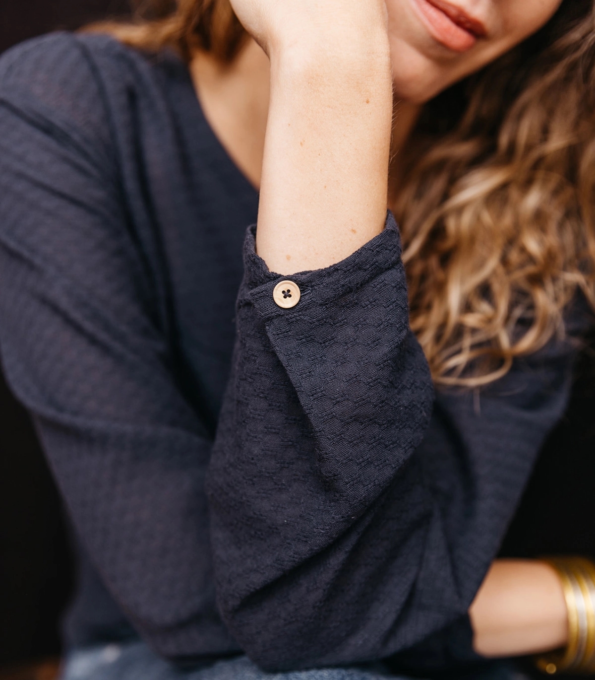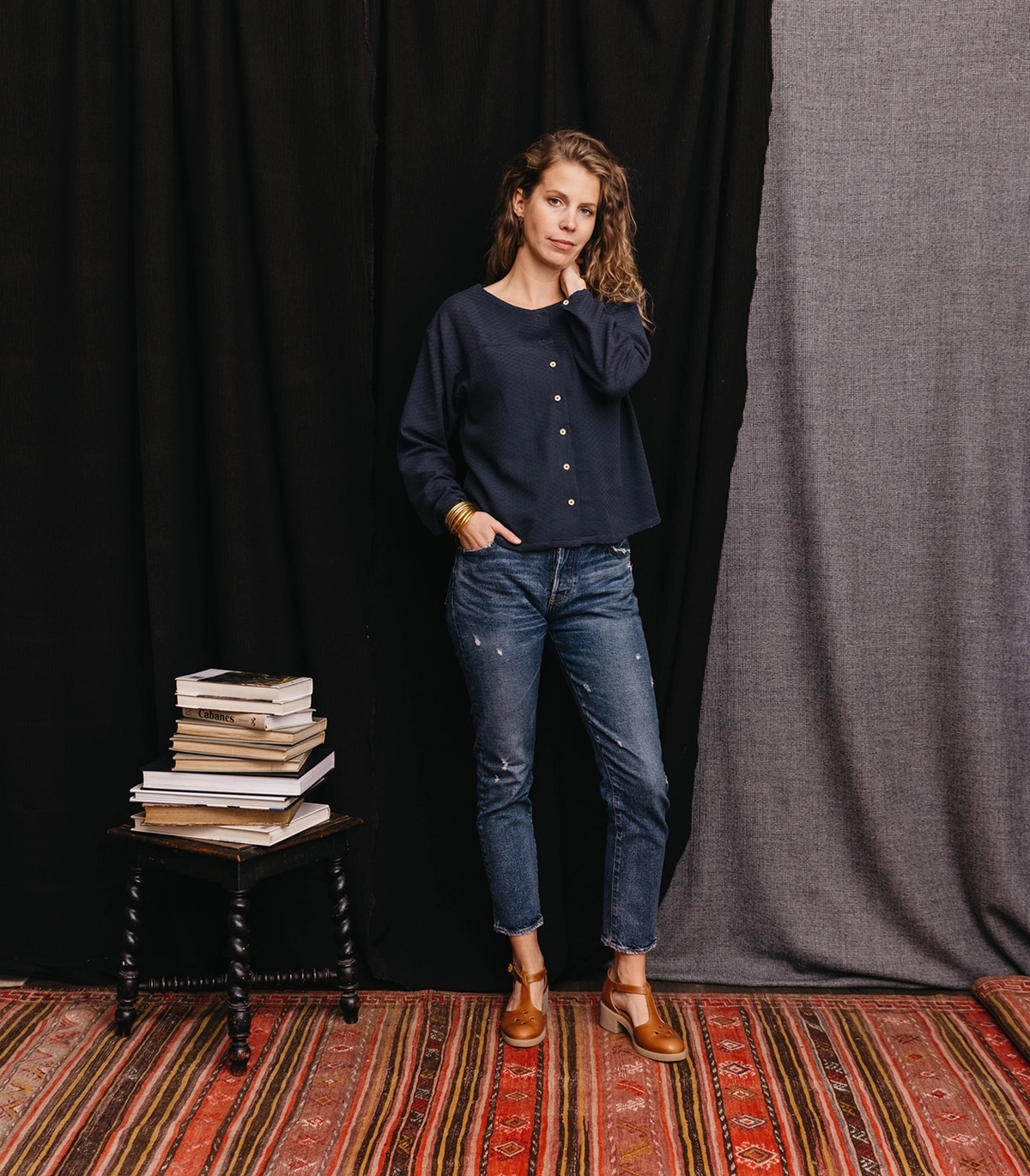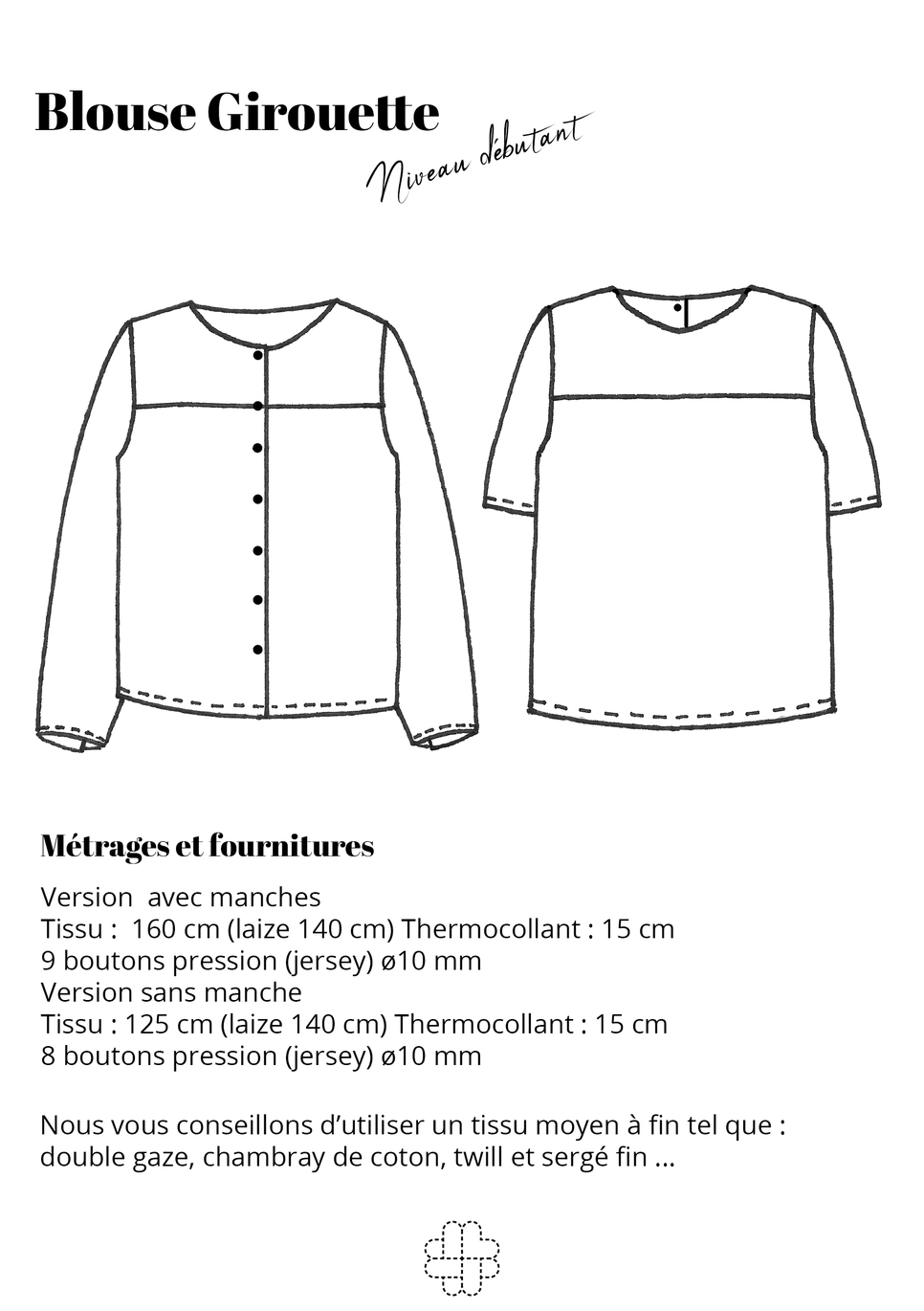 'Cirouette' er en enkel og begyndervenlig bluse med bærestykke, knaplukning for eller bag og korte eller lange ærmer.