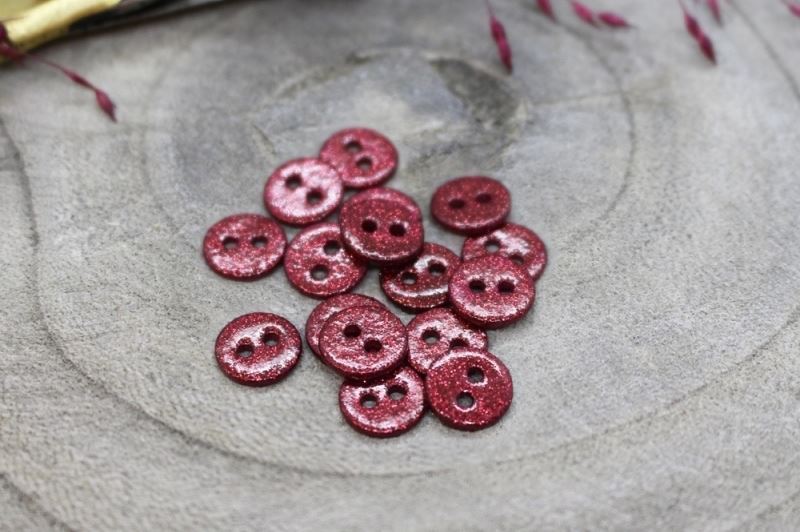 9 mm. perlemorsknap belagt med vinrødt glimmer (Oeko-tex certificeret).
