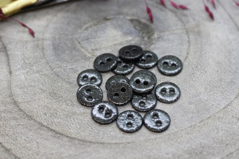 9 mm. perlemorsknap belagt med sort glimmer (Oeko-tex certificeret).