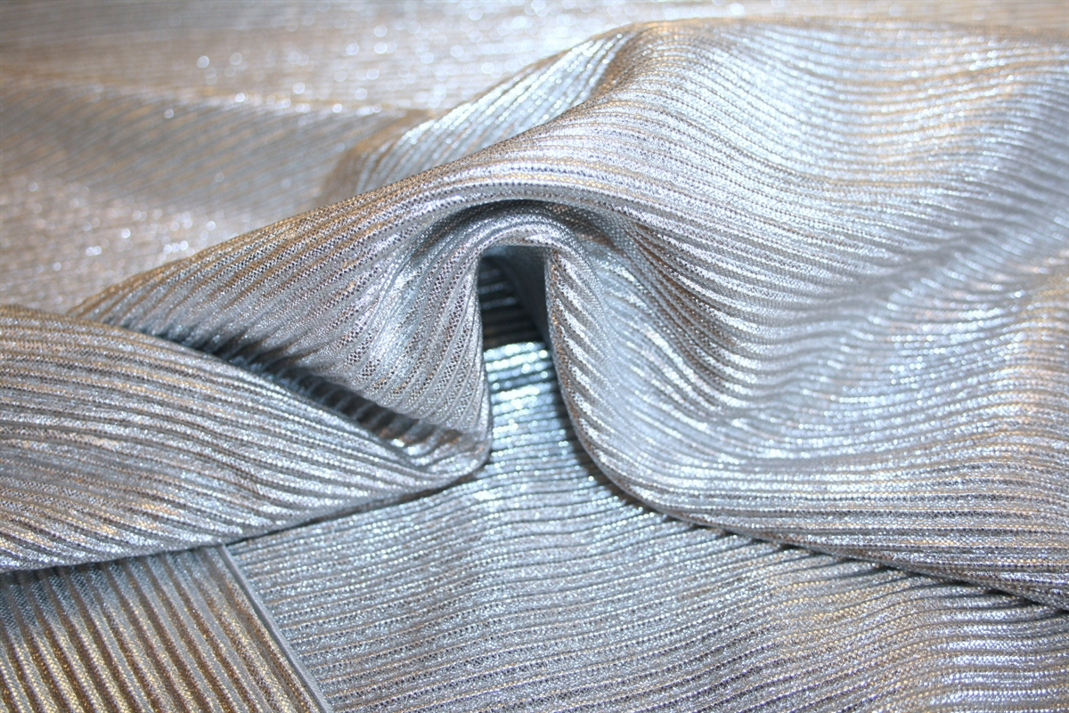 Gå festsæsonen i møde med et funklende outfit i denne skinnende sølvfarvede plissé. Plisseringerne ligger vandret, men kan selvfølgelig vendes, hvis de ønskes på langs. Stoffet giver sig på begge leder.