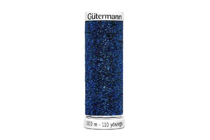 100 m. Gütermann sytråd med metaleffekt. Tråden kan bruges til dekorative sømme i lette-medium vægt metervarer.