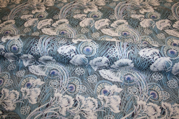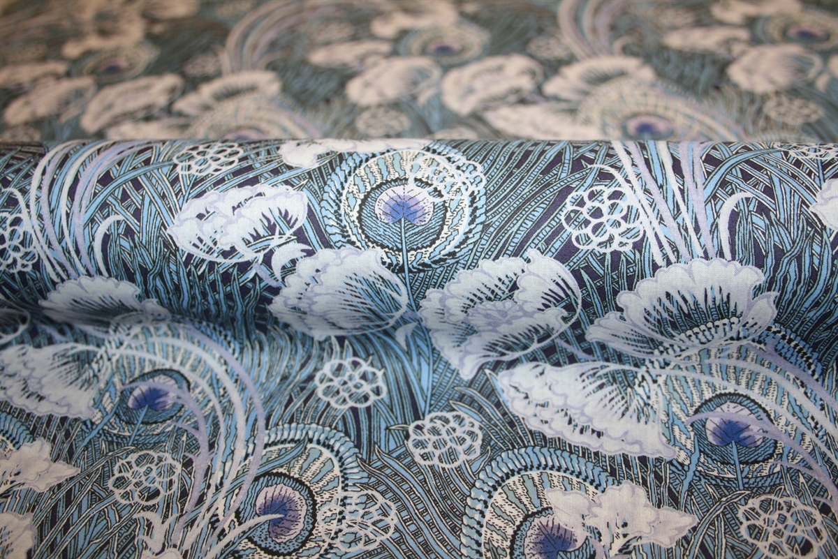 Liberty Tana Lawn™ i 100% bomuld med påfuglefjer, slyngende valmuer og blomstrende grene i smuk forening. Stoffet er oeko-tex certificeret, dvs. uden skadelig kemi.