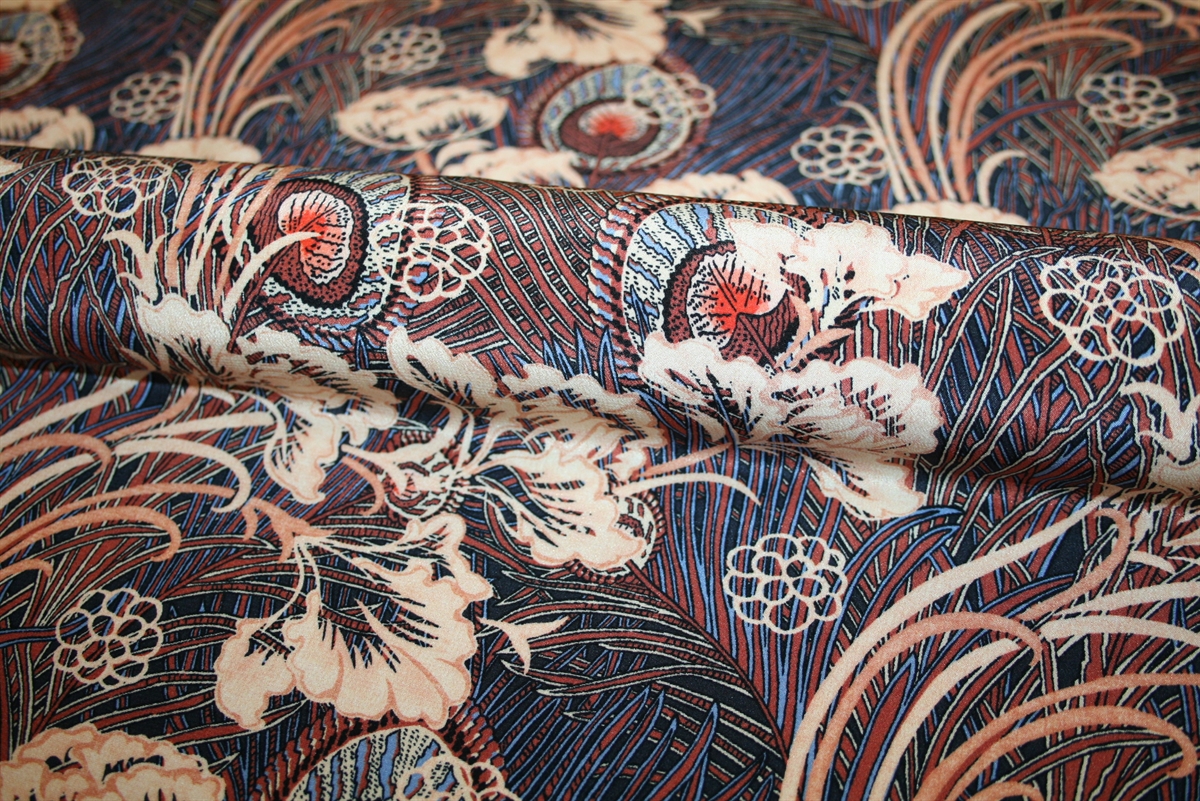 Luksuriøs silke crepe de chine med påfuglefjer, slyngende valmuer og blomstrende grene i smuk forening. Silken er fra Liberty Fabrics.