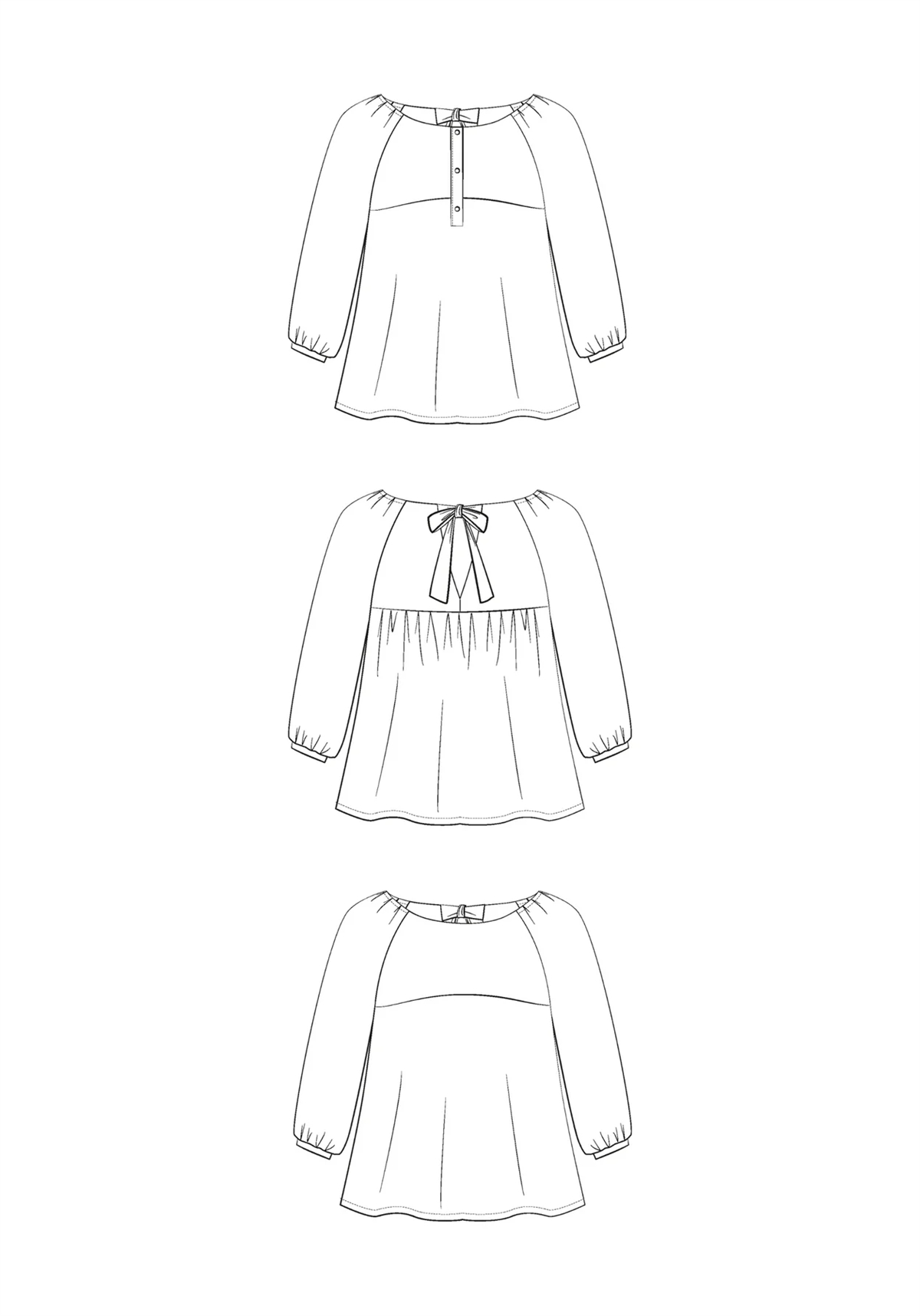 Med sin klokkeformede silhuet er Hespéride konstrueret med smukke bærestykker, komfortable raglanærmer samt en åben og afrundet halsudskæring. Snittet sidder til over brystet og går ud i en let A-form under det forreste bærestykke – uden rynker – for at undgå uønsket volumen ved brystet. Ryggen er samlet under bærestykket for at tilføje bevægelse og har en elegant åbning, der lukkes med et bredt og feminint bindebånd.