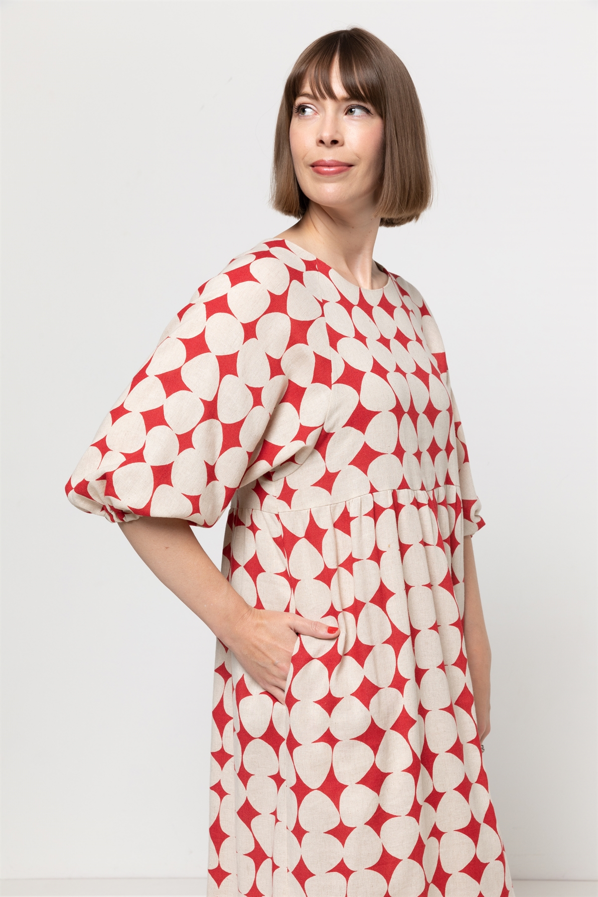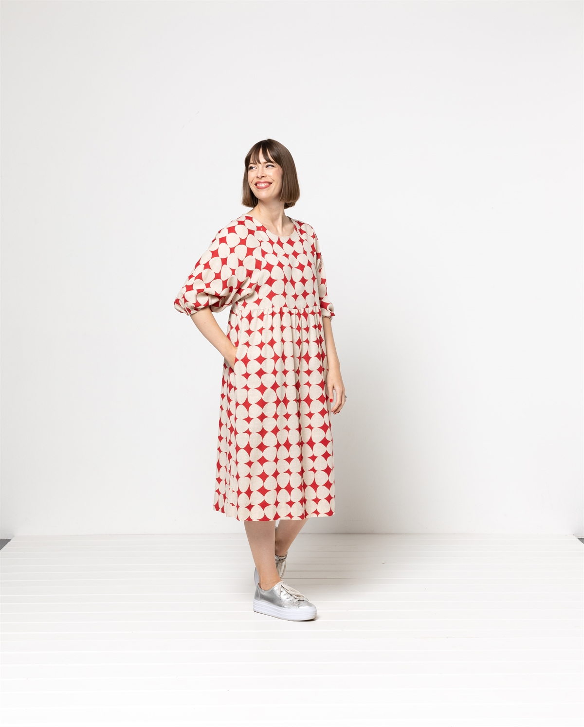 Drømmer du om en kjole, der både er komfortabel, feminin og tidløs? Og nem at sy? Så er 'Hope Woven Dress' et rigtig godt bud. Med symønsteret får du en let og luftig kjole med raglan ærmegab, lommer og elegante ærmer 7/8, der afsluttes med en blød elastik. Den lille knaplukning i nakken giver et delikat touch, mens de to skørtlængder – knæ eller midi – gør det muligt at skabe præcis det look, du ønsker.