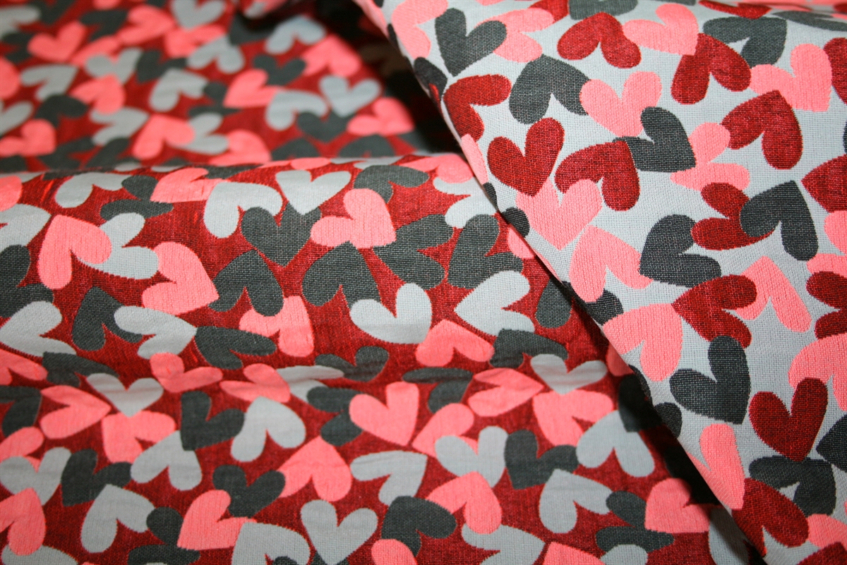 Vendbar fransk jacquard med let udstående hjerter. Kvaliteten er let-medium kraftig og blød, men stadig med lidt hold.