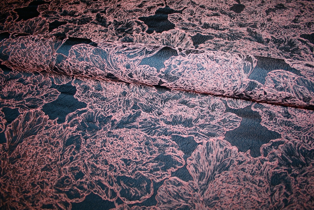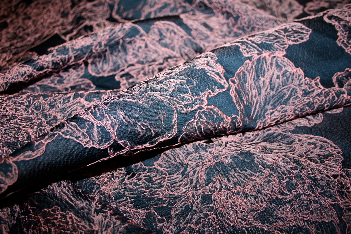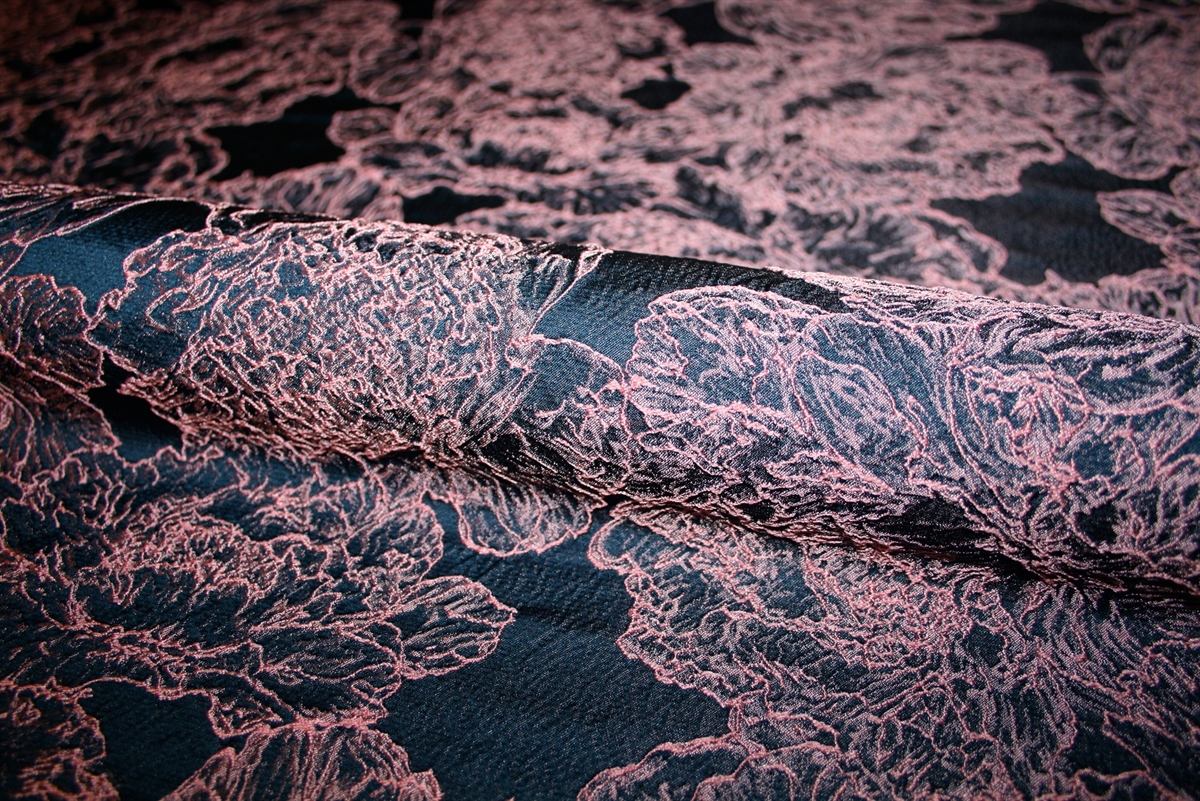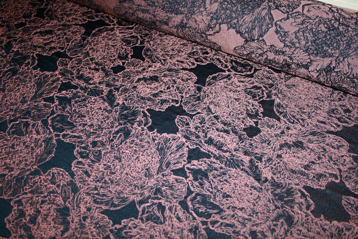 Smuk italiensk jacquard med let udstående lyserøde blomster på en navy bund. Kvaliteten er let-medium kraftig, blød og giver sig på tværs. Sy fx en nederdel eller jakke.
