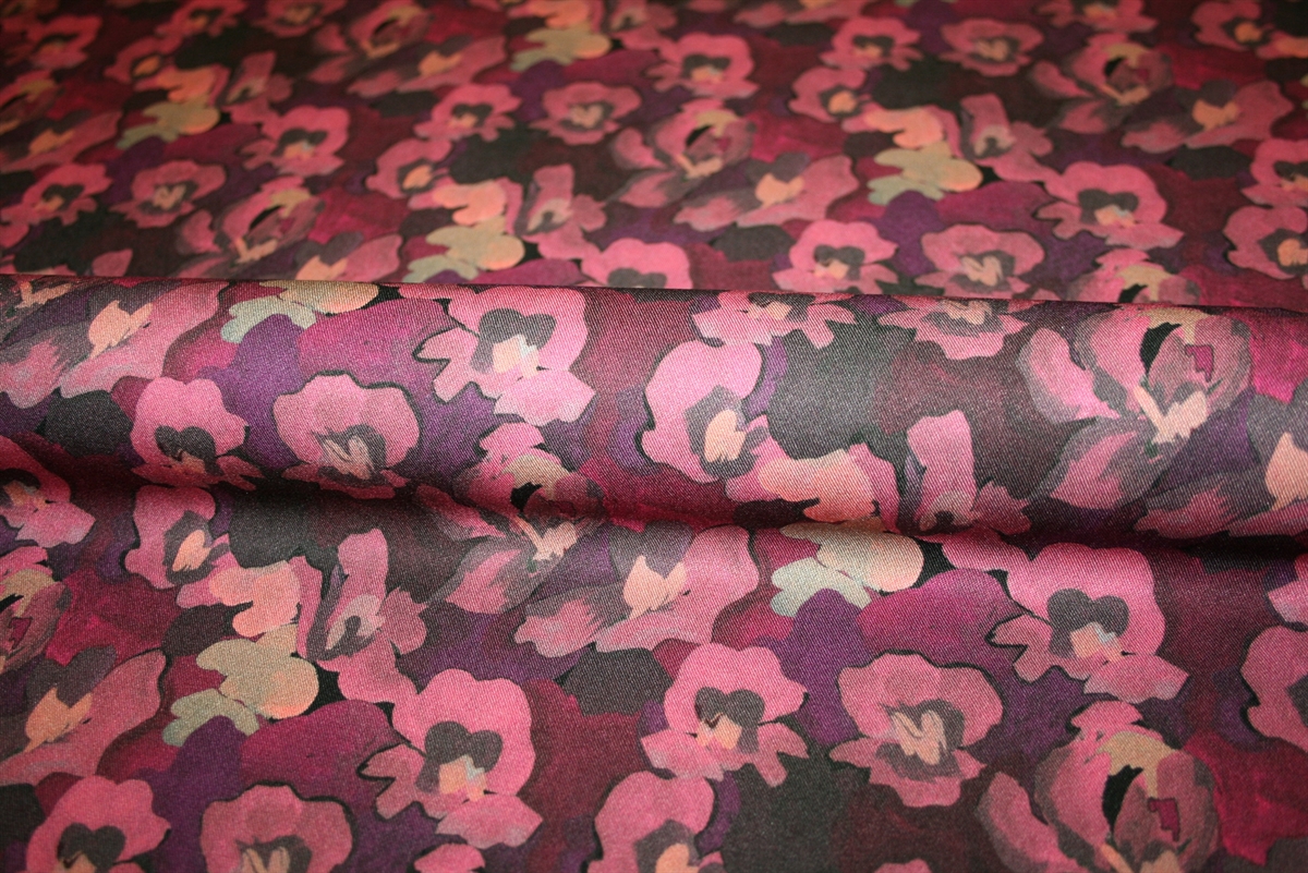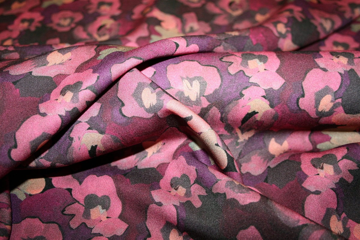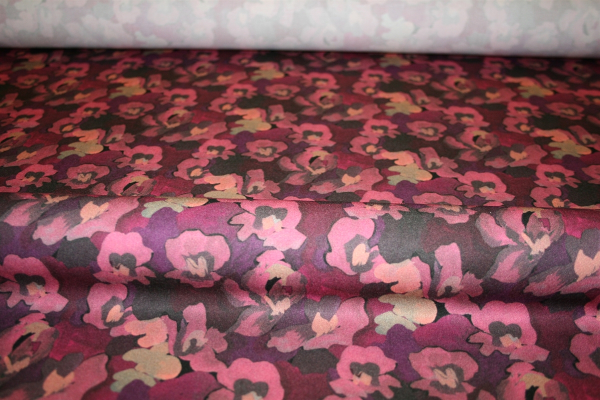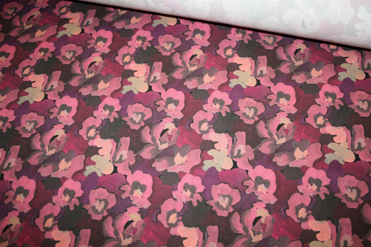 Twillvævet 'Weymouth' viskose med et smukt print i lyserøde og bordeaux nuancer. Sublim kvalitet fra Liberty Fabric til den kræsne.