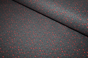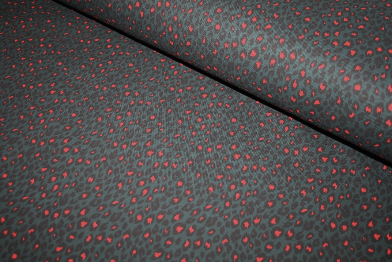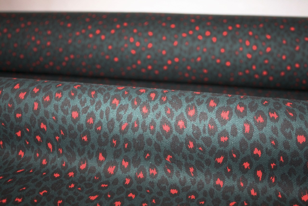 Diagonalvævet bomuldsdenim med dyreprint i sort og rød på en flaskegrøn bund. Kvalitetet er fast og medium kraftig.