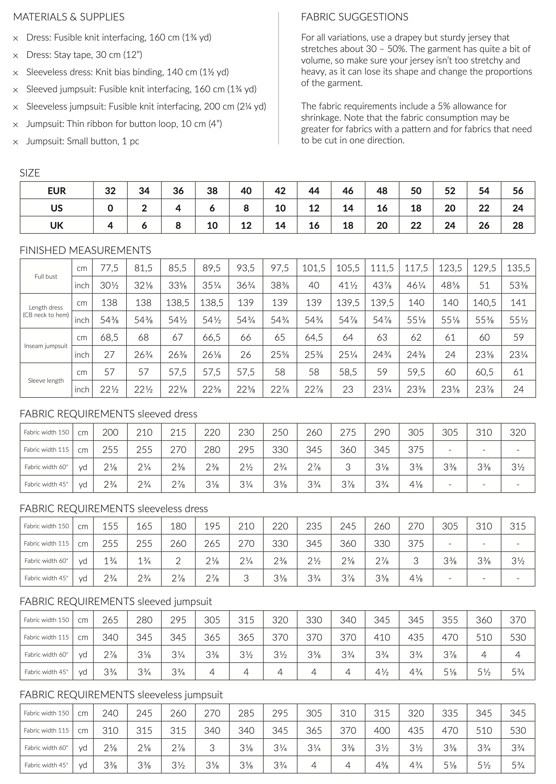 • Kjole m. ærme: 2-3,2 m. stof (v. stofbredde 150 cm.)
