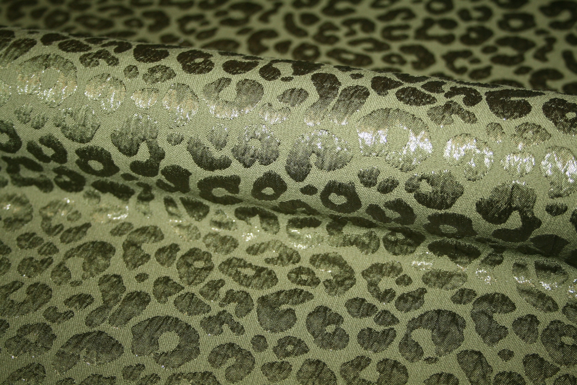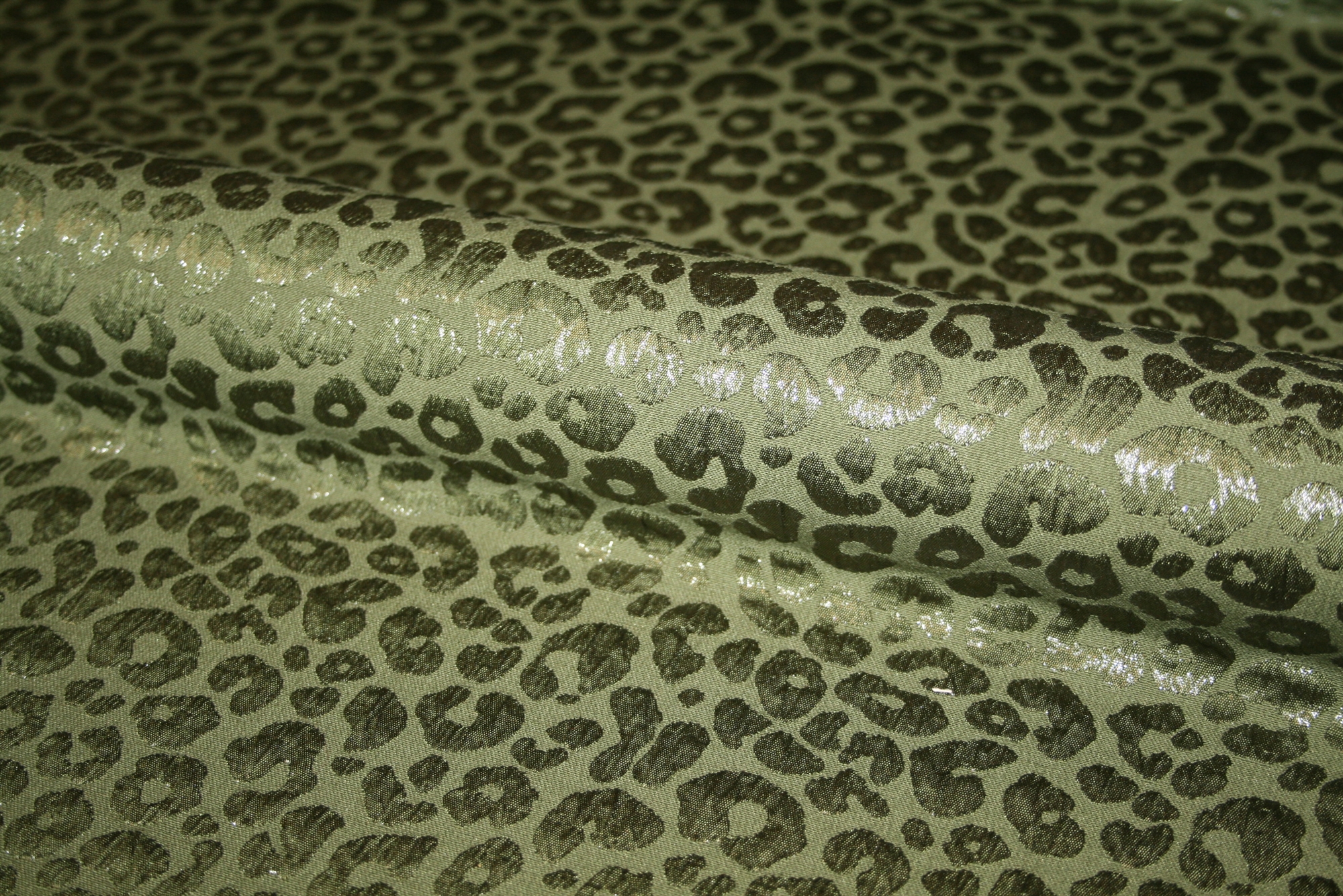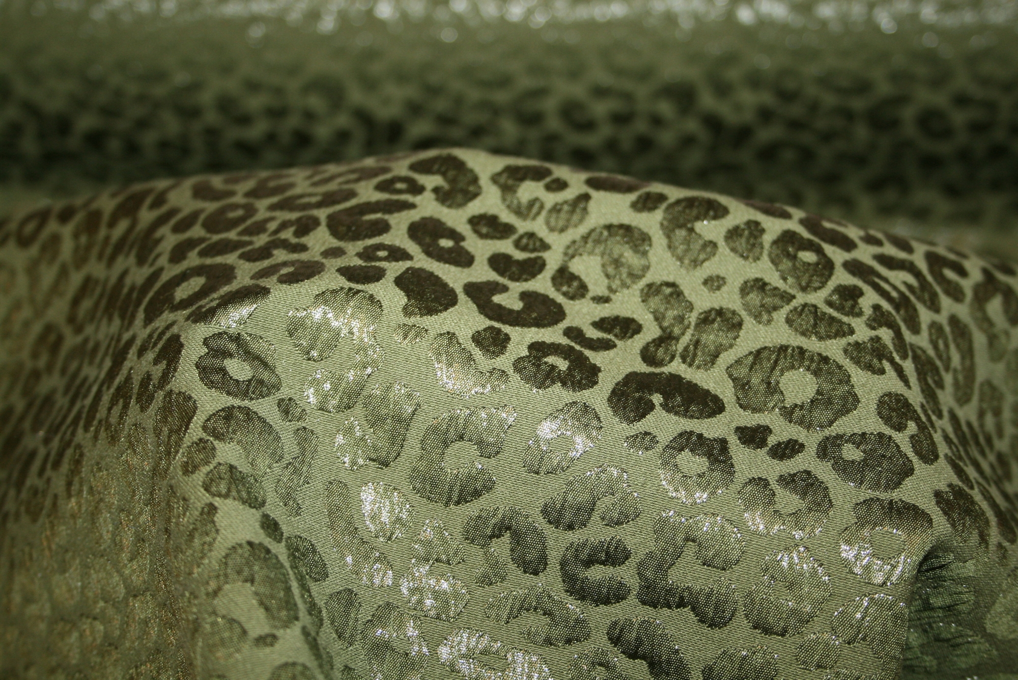 Jacquardvævet metervare med skinnende og let udstående leo mønster på en mat mosgrøn bund. Lettere kvalitet der fx kan bruges til nederdel eller overdel med skulpturelle ærmer.