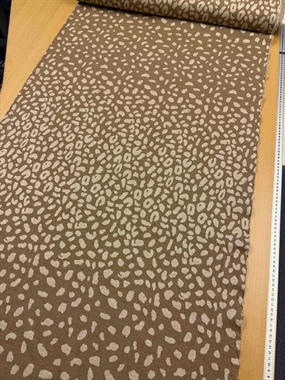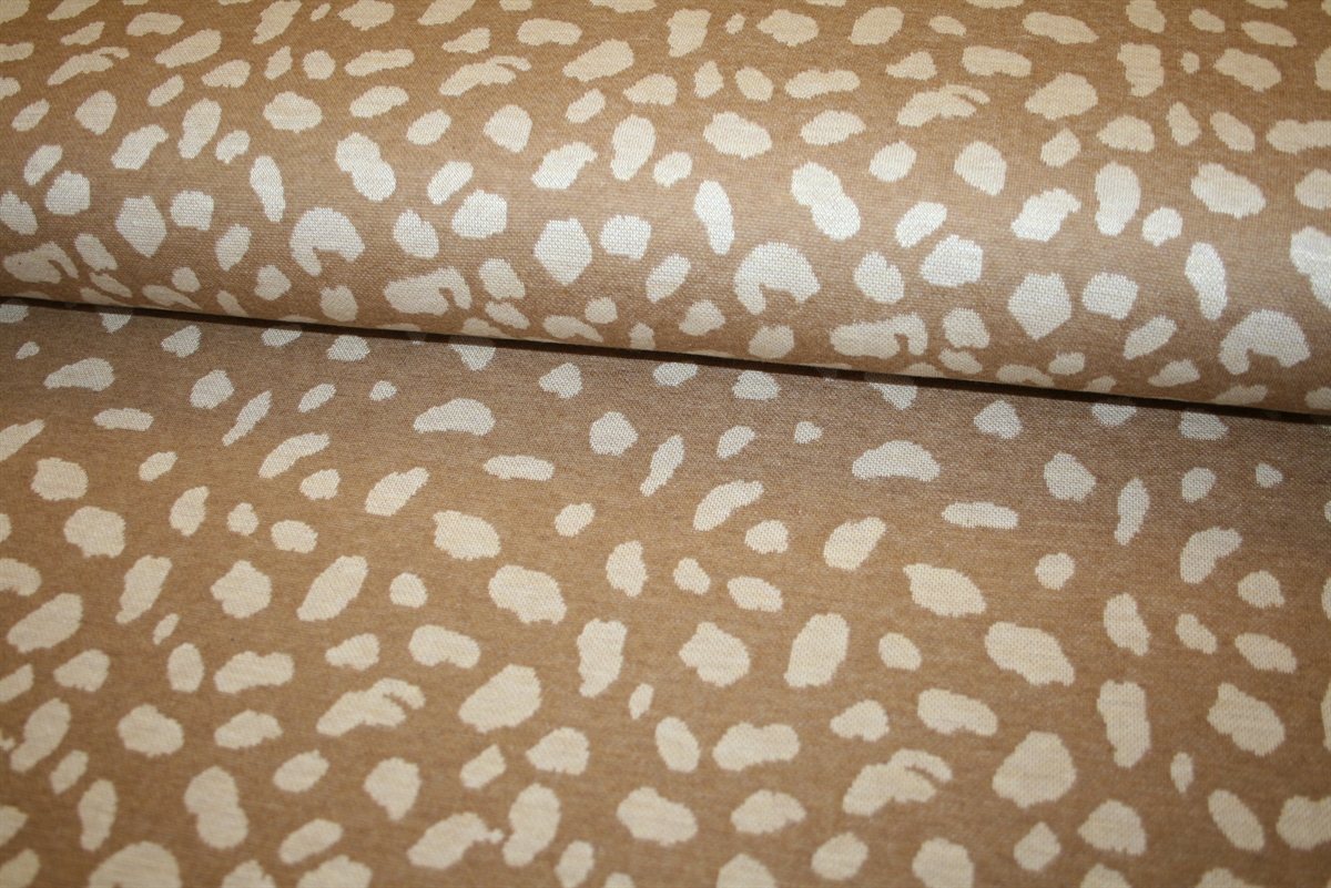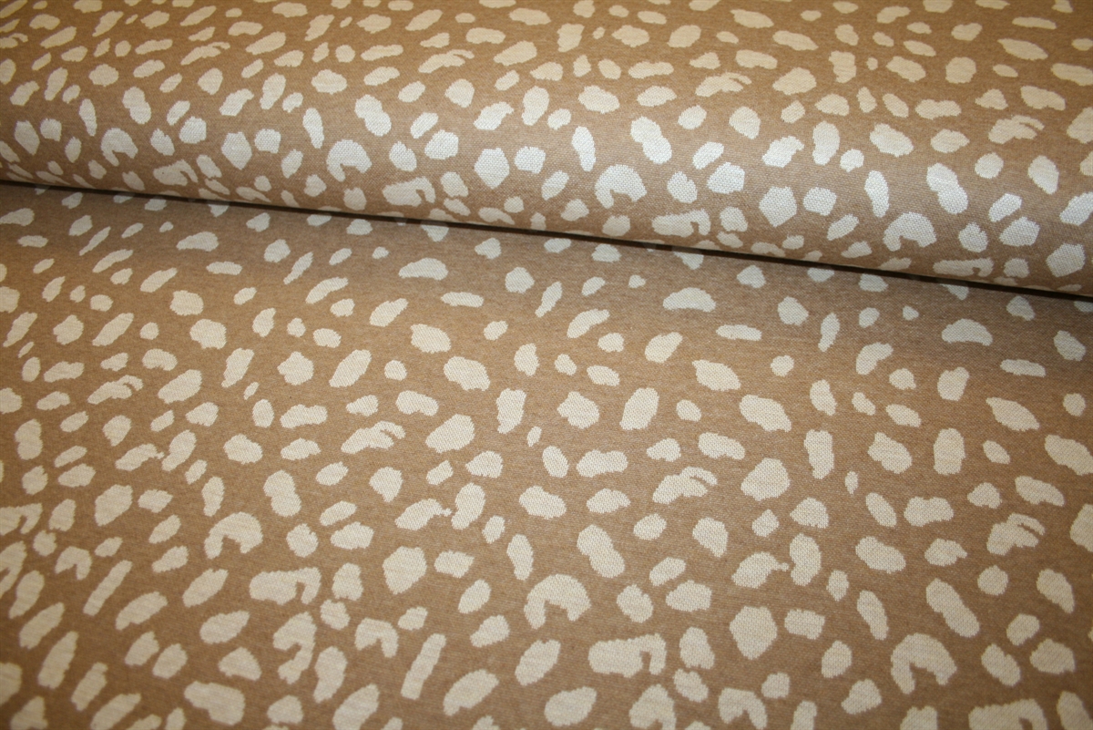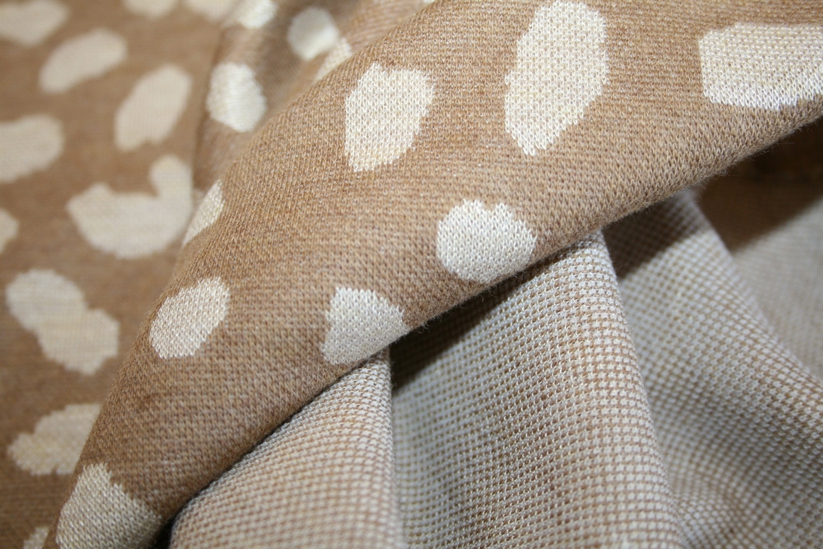 Jacquardstrikket bomuldskvalitet med elastan, der kombinerer komfort og fleksibilitet. Jacquard-strukturen betyder, at mønsteret er strikket ind i stoffet – ikke trykt på – hvilket giver en mere eksklusiv og slidstærk kvalitet. Stoffet har et moderne, dyreinspireret mønster i camel og sandfarve, der intensiveres og fader og har altså en mønsterrapport (se i billedserien).