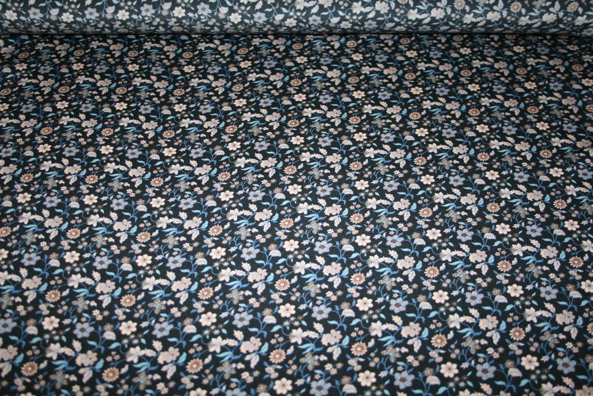 Liberty silke crepe de chine med små blomster på en midnatsblå bund.
