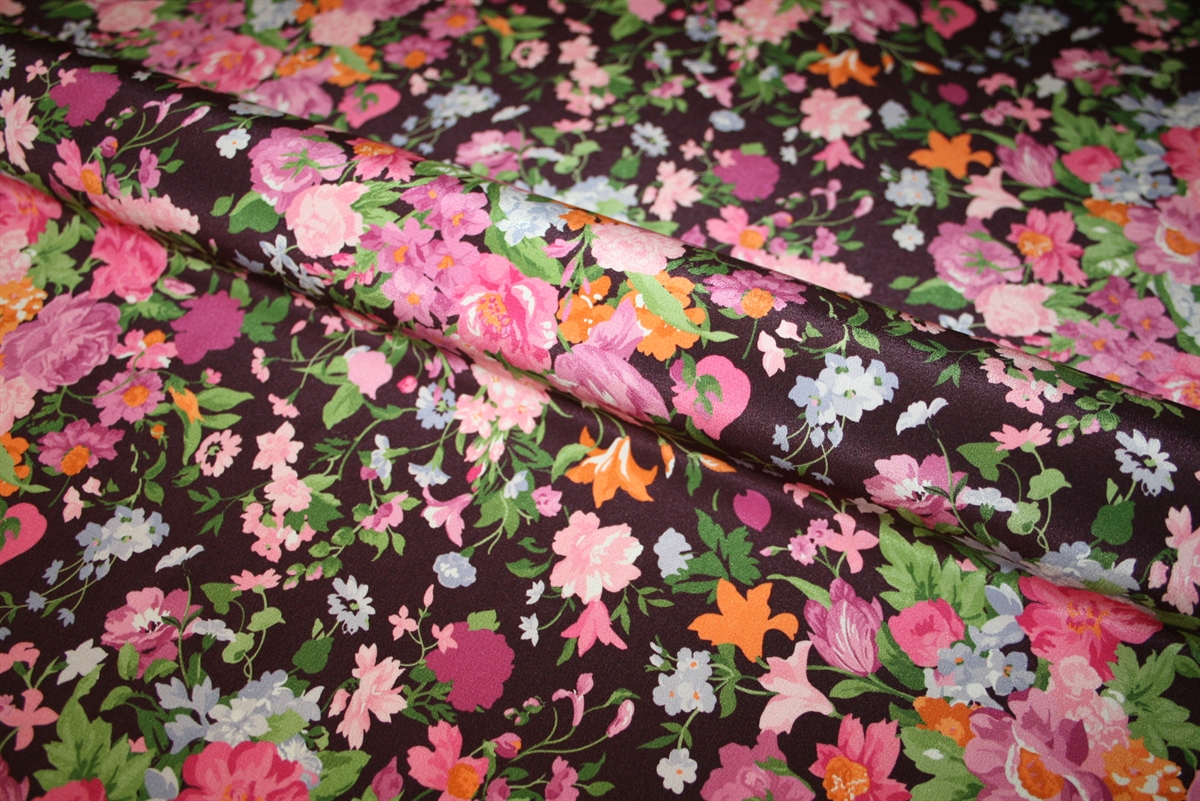 Crepe de chine 100% silke med blomsterbuketter på en aubergine bund.