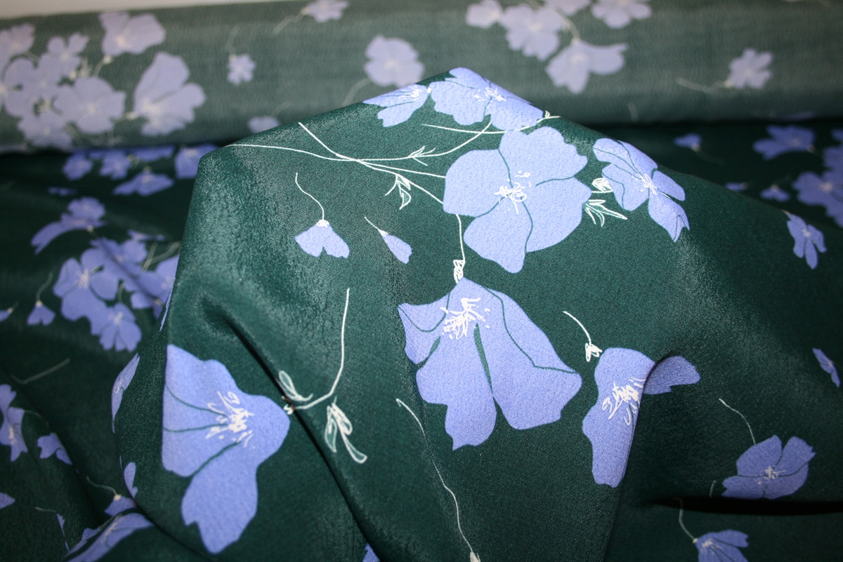 Flaskegrøn viscose crepe med lilla blomsterFlaskegrøn viscose crepe med lilla blomster