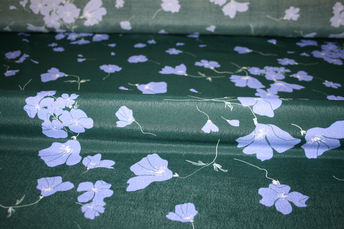 Crepevævet viscose med lilla blomster på en flaskegrøn bund. Kvaliteten er let og glansfuld.