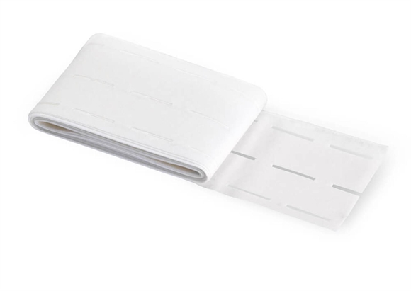 Anvendelse: Pres båndet på linningens vrangside ved medium varme i tryk á ca. 8 sekunder. Brug udstansningerne når du syer og ombukker for nemt at opnå et flot og præcist resultat