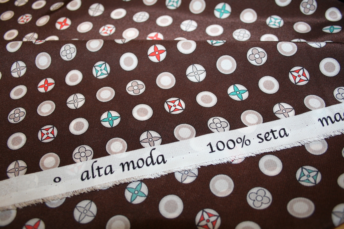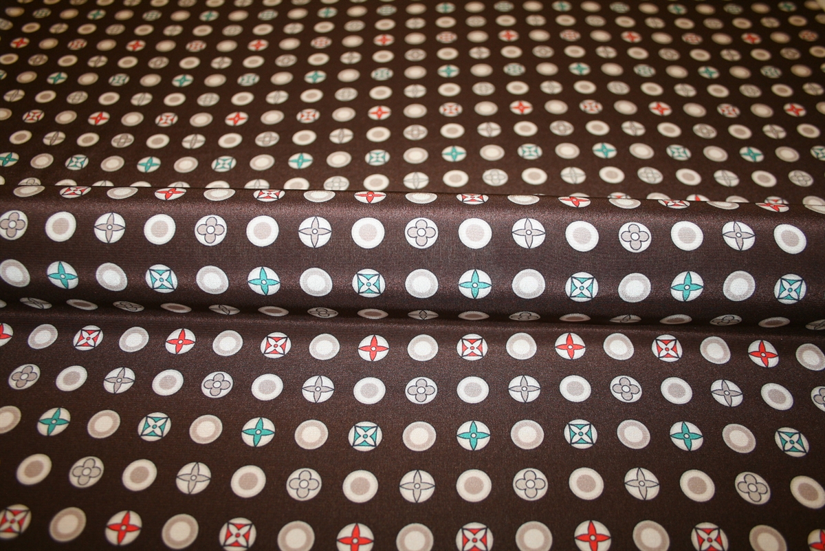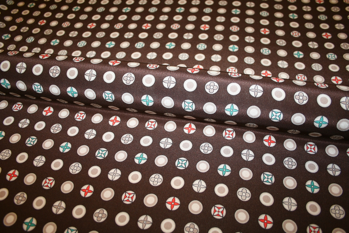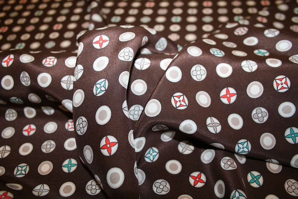 Deadstock silke stof med LV loger på brun bundDeadstock silke stof med LV loger på brun bundDeadstock silke stof med LV loger på brun bundDeadstock silke stof med LV loger på brun bund