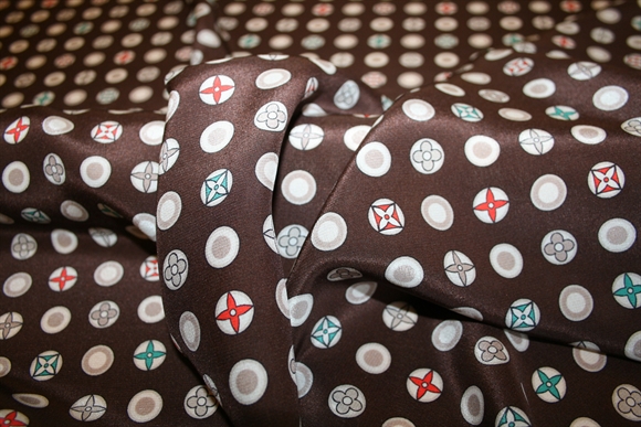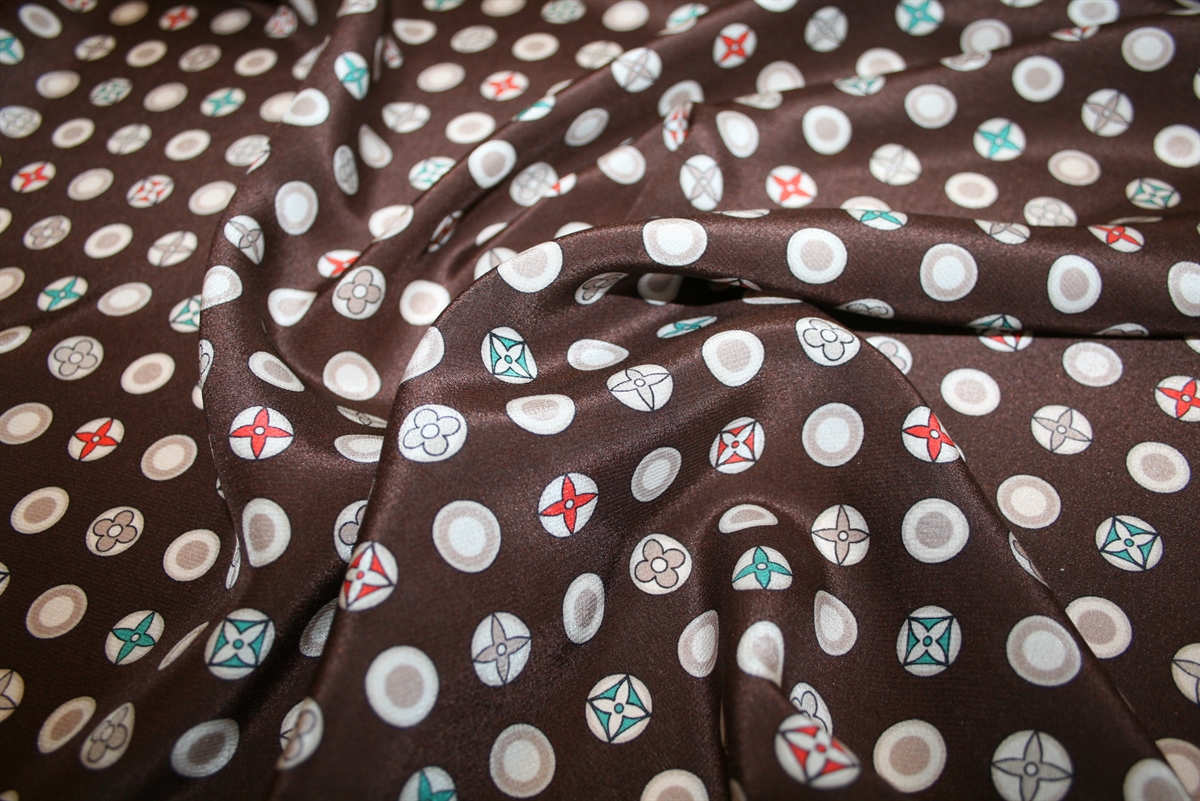 100% silke crepe de chine med LV logoprint på en brun bund.