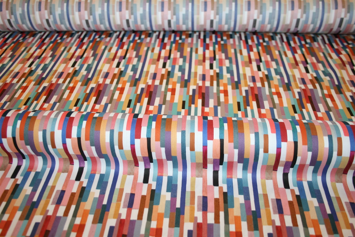 Maksimus er et unikt Liberty-stof, hvor farve og struktur mødes i et iøjnefaldende geometrisk mønster. Printet består af rektangulære blokke i kontrasterende og komplementære nuancer, oprindeligt inspireret af håndmalede farveprøver fra Liberty-arkivet. Disse små malede farvefelter blev tidligere anvendt som referencepaletter i kunstneriske værker – nu gentænkt som et moderne tekstildesign.