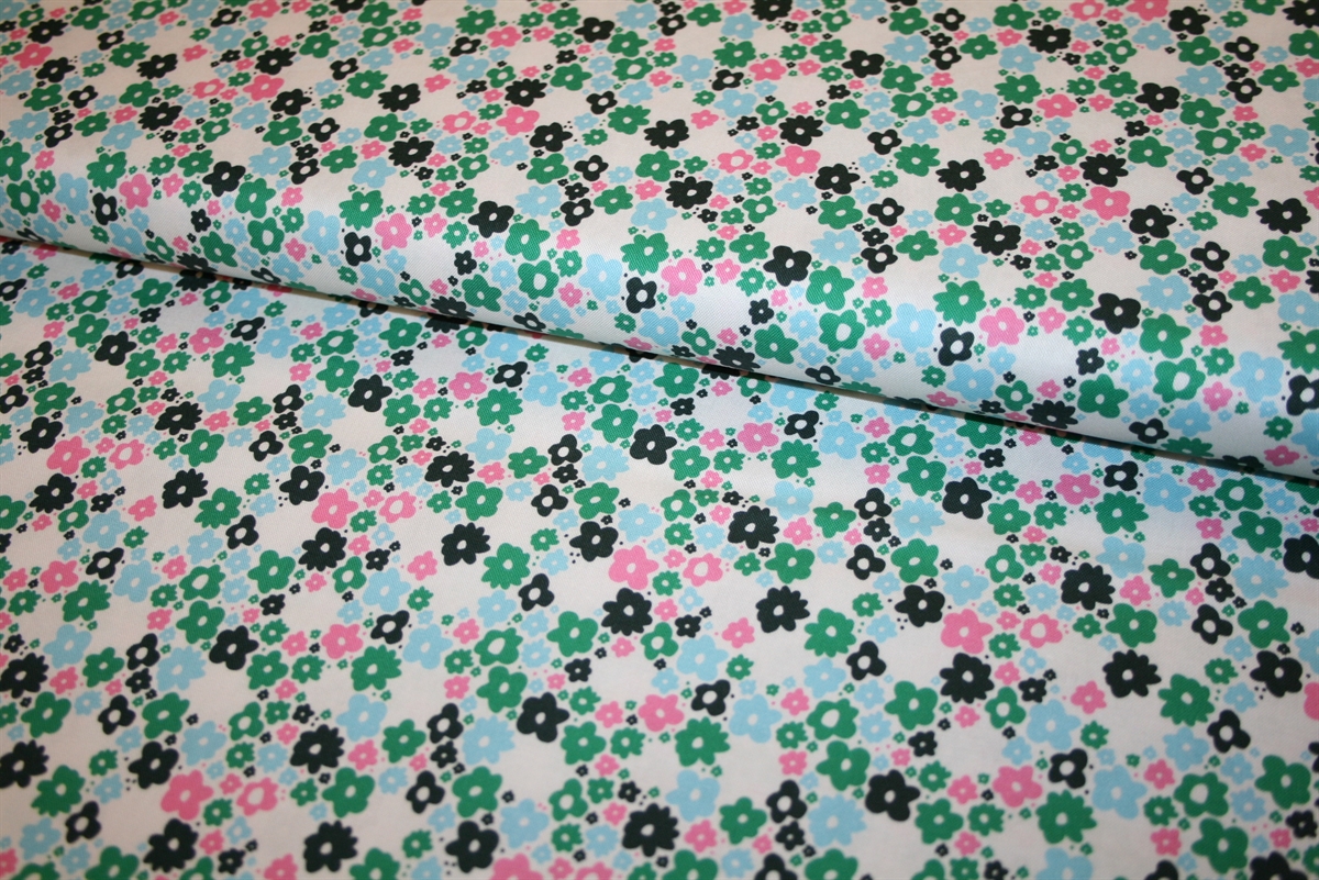 100% bomuld fra Cotton + Steel med små sommerblomster på en lys bund. Kvaliteten er medium kraftig og sprød.